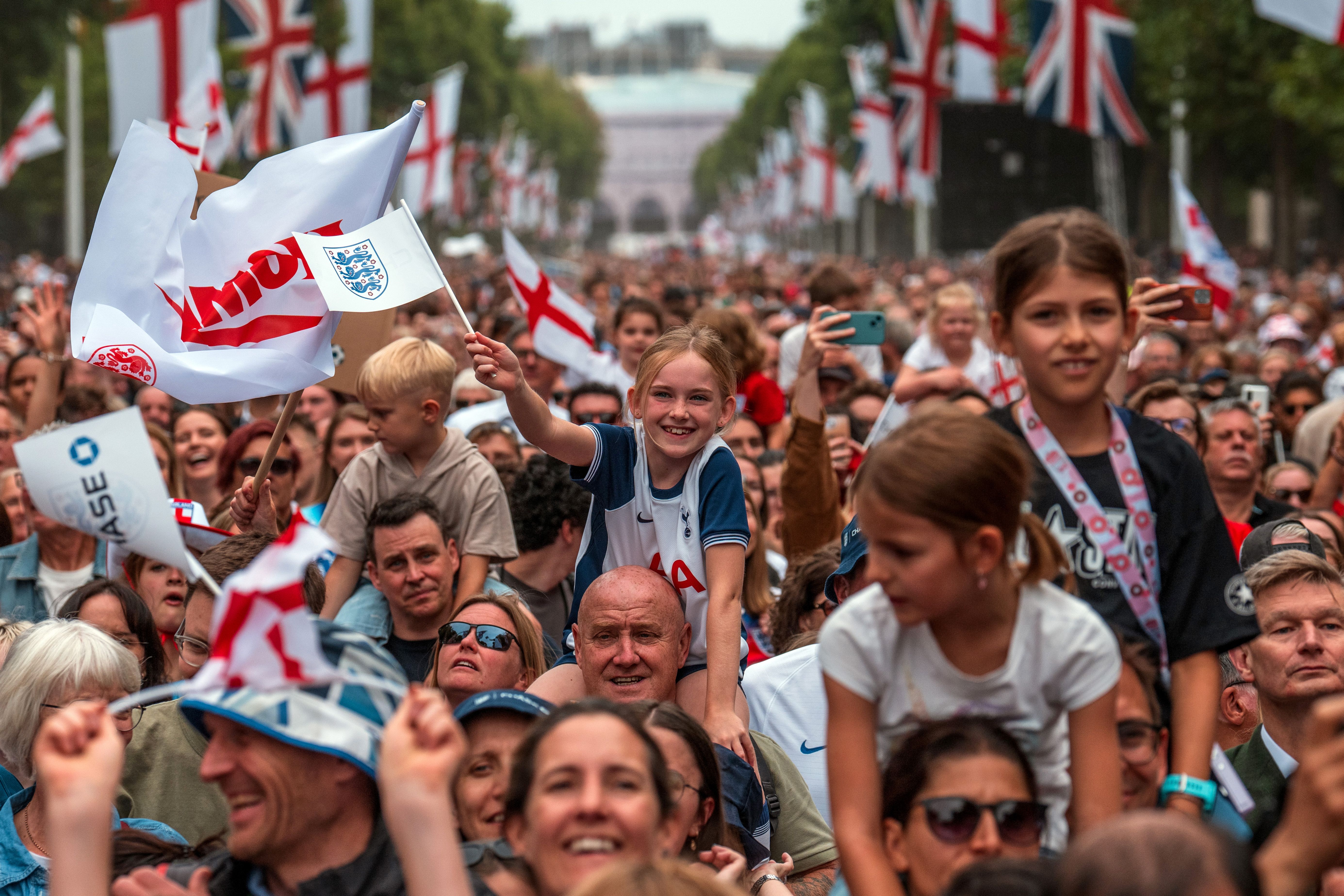 Fans fill The Mall after the England Women's football team open-top bus victory parade and celebration on July 29, 2025 in London, England. England defeated Spain in the UEFA Women's EURO 2025 Final to retain the trophy on 27 July. (Photo by Carl Court/Getty Images)
