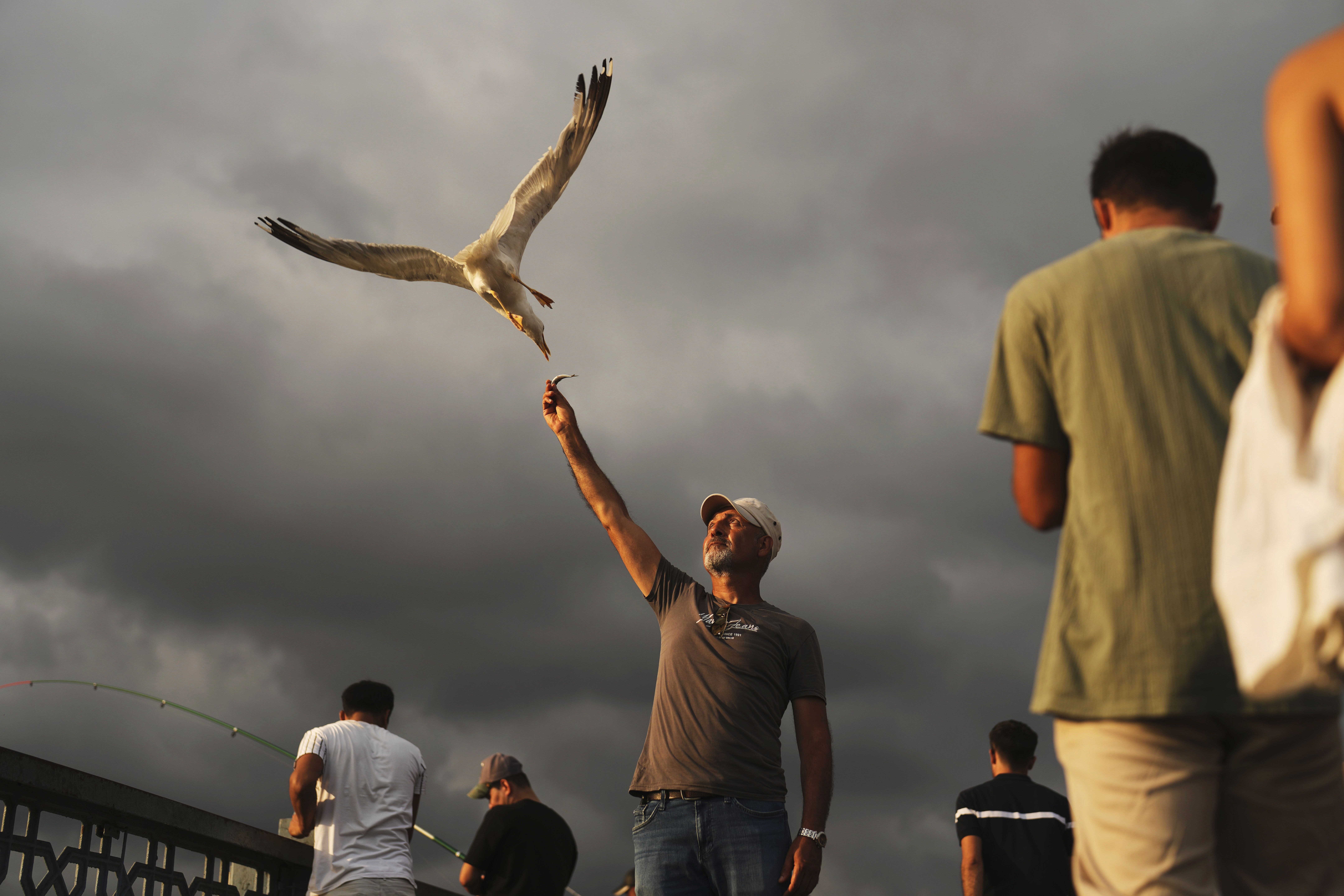 Local fisherman Bulent Buyuk Turhan feeds seagulls with small fishes he has just caught at Galata bridge, in Istanbul, Turkey, Tuesday, August 5, 2025. (Photo by Francisco Seco/AP Photo)