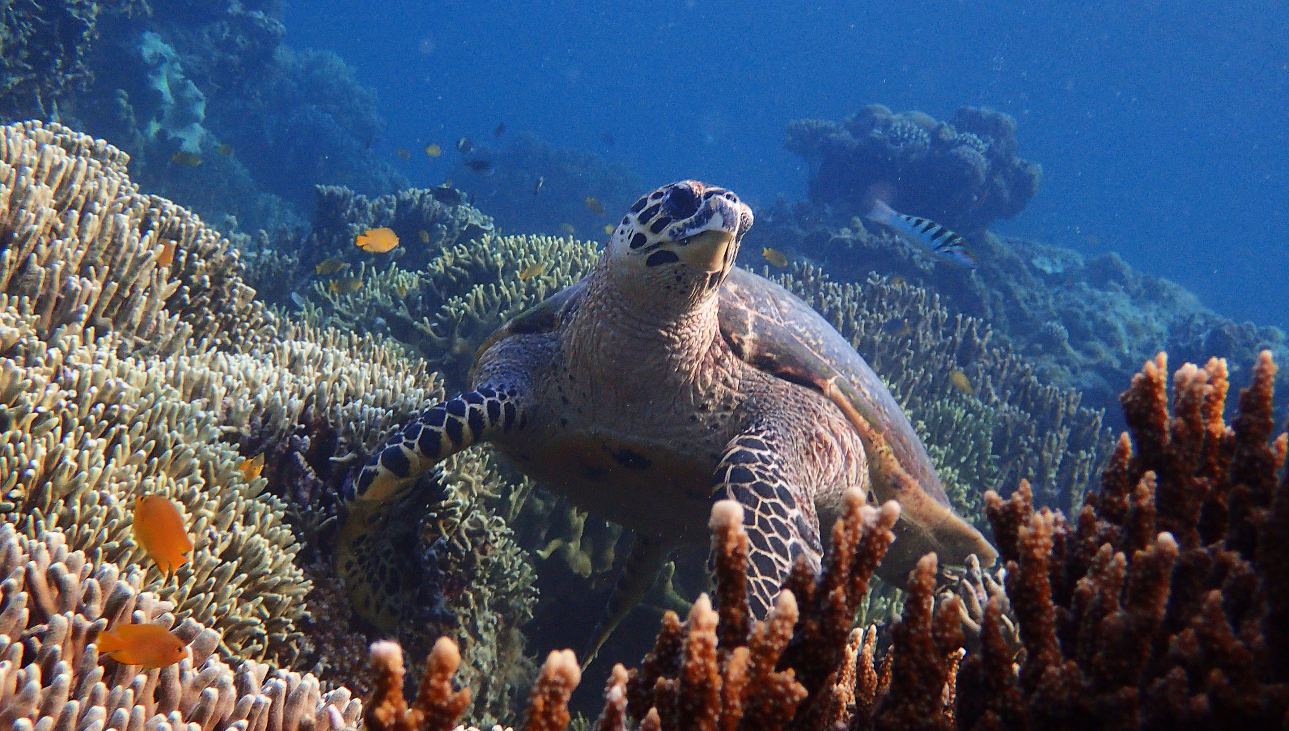 A sea turtle rests on a coral reef near the Philippines. (Photo by Travel Trend/Getty Images/iStockphoto)
