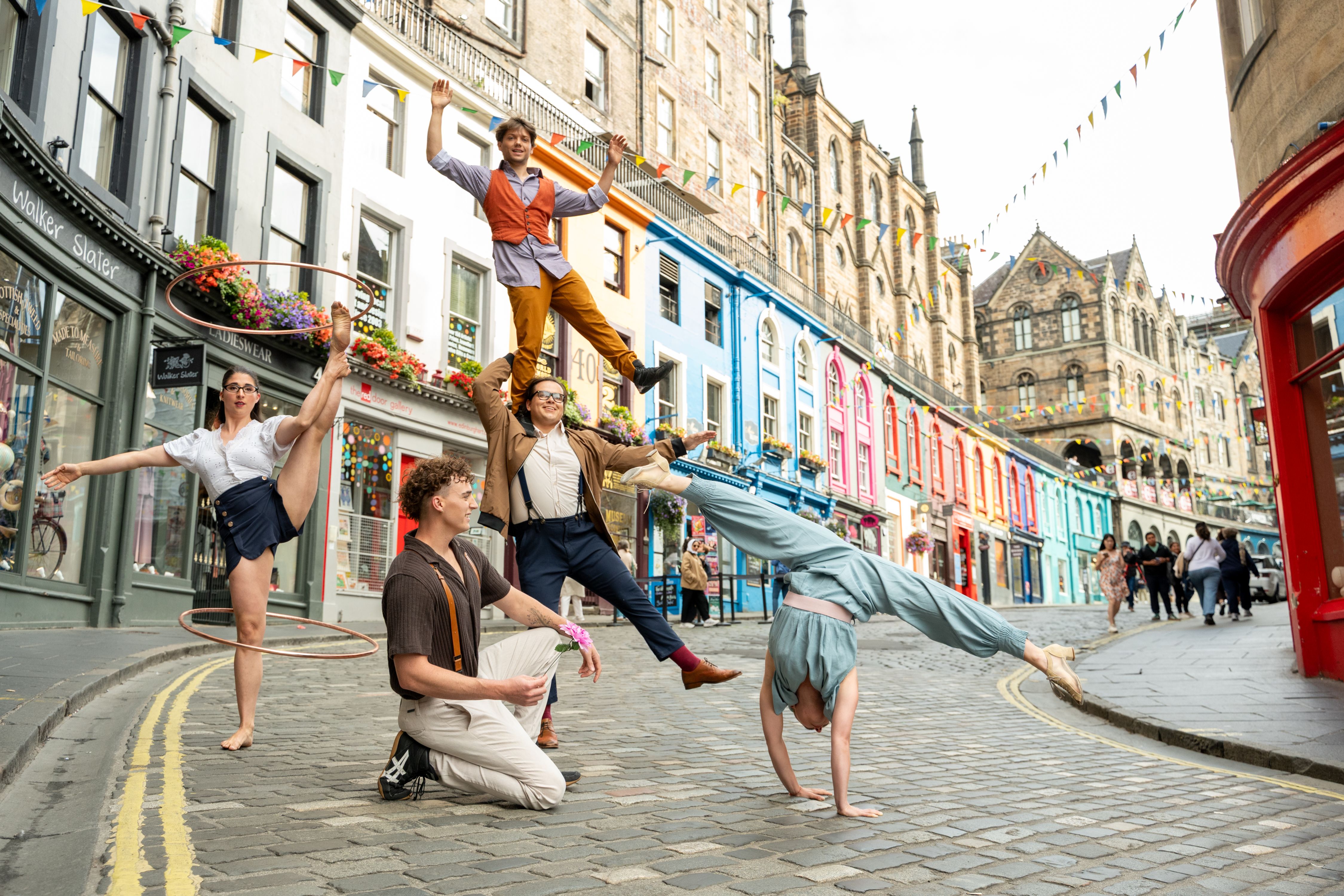 Members of the cast of circus company Flip Fabrique perform extracts from their show during a photocall in Victoria Street ahead of the start of the Edinburgh Fringe on July 31, 2025 in Edinburgh, Scotland. (Photo by Roberto Ricciuti/Getty Images)