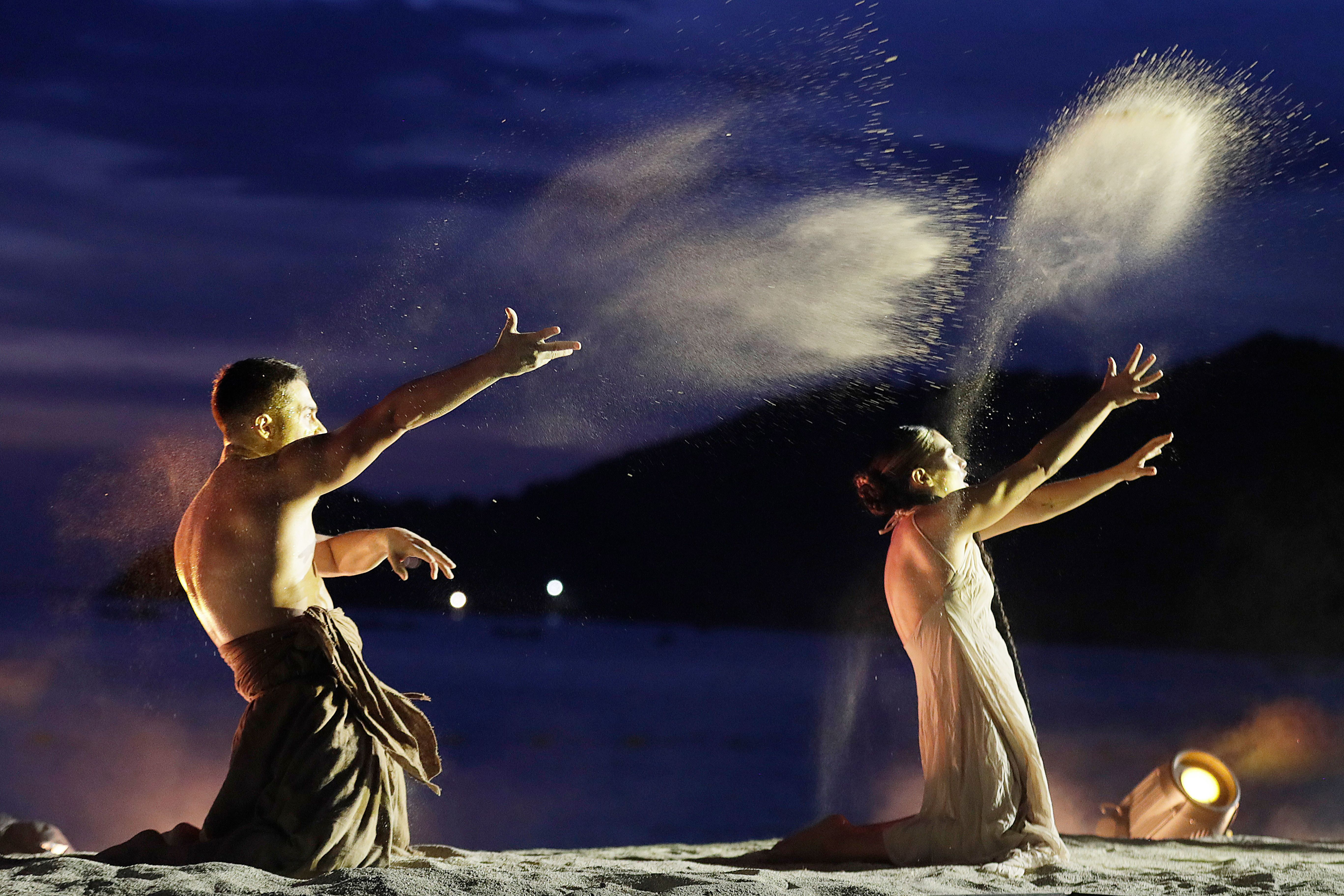 Artists perform in the play “Ceremonia Viva” during the 500th anniversary commemoration of the founding of Santa Marta, Colombia, 29 July 2025. On the shores of the Caribbean Sea, on El Rodadero beach, Santa Marta marked the milestone with a theatrical ceremony blending music, memory, fire, spirituality, and popular celebration, honoring a history that began long before the arrival of the conquistadors. (Photo by Carlos Ortega/EPA)