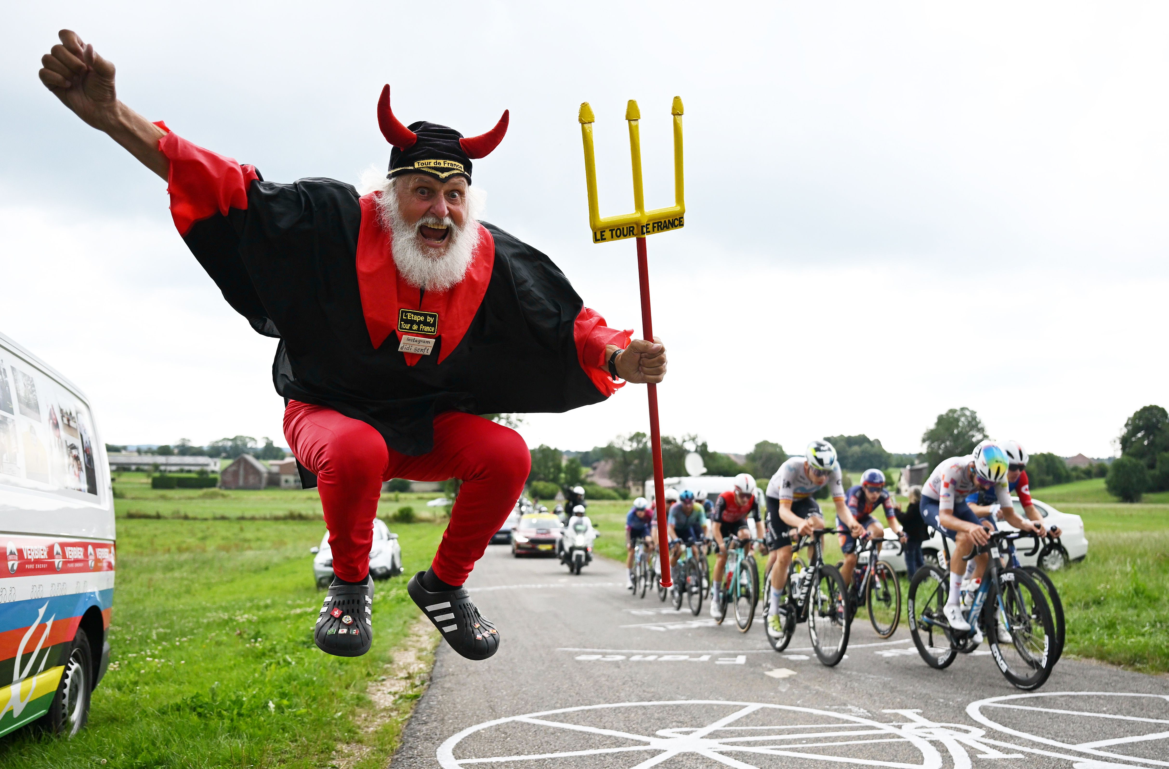 Tour stalwart Didi Senft, aka El Diablo, cheers the chasing group of riders at Stage 20, Nantua to Pontarlier on July 24, 2025. (Phoot by Tim de Waele/Getty Images)