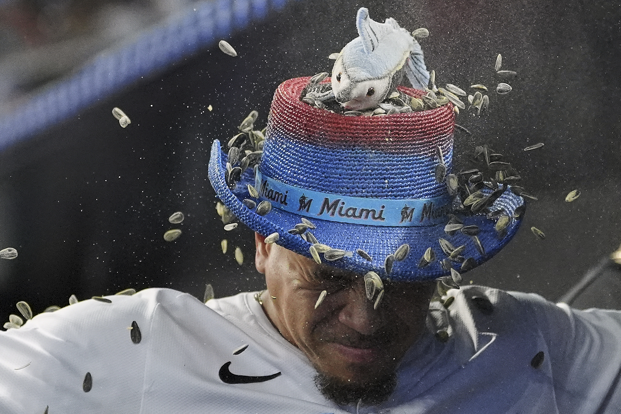 Miami Marlins' Heriberto Hernandez is doused with sunflower seeds in the dugout after hitting a home run in the third inning of a baseball game against the Houston Astros, Wednesday, August 6, 2025, in Miami. (Photo by Rebecca Blackwell/AP Photo)