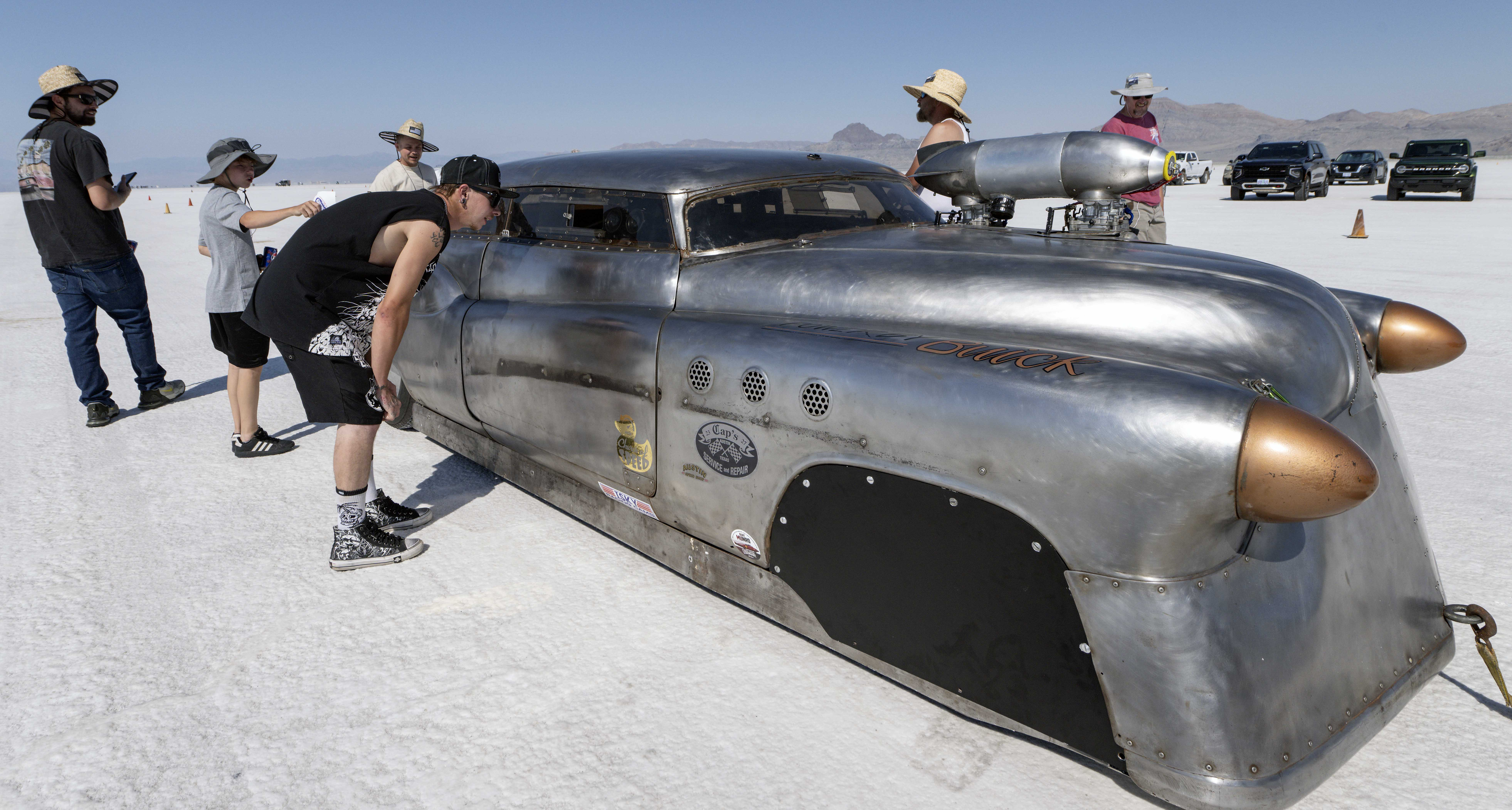 Cars are positioned in the staging area during the Southern California Timing Association’s Speed Week on the Bonneville salt flats in Wendover, Utah on August 6, 2025. The event has resumed after a driver was killed when he lost control of his car during a speed-record attempt. (Photo by Brian Cahn/Zuma Press Wire/Rex Features/Shutterstock)