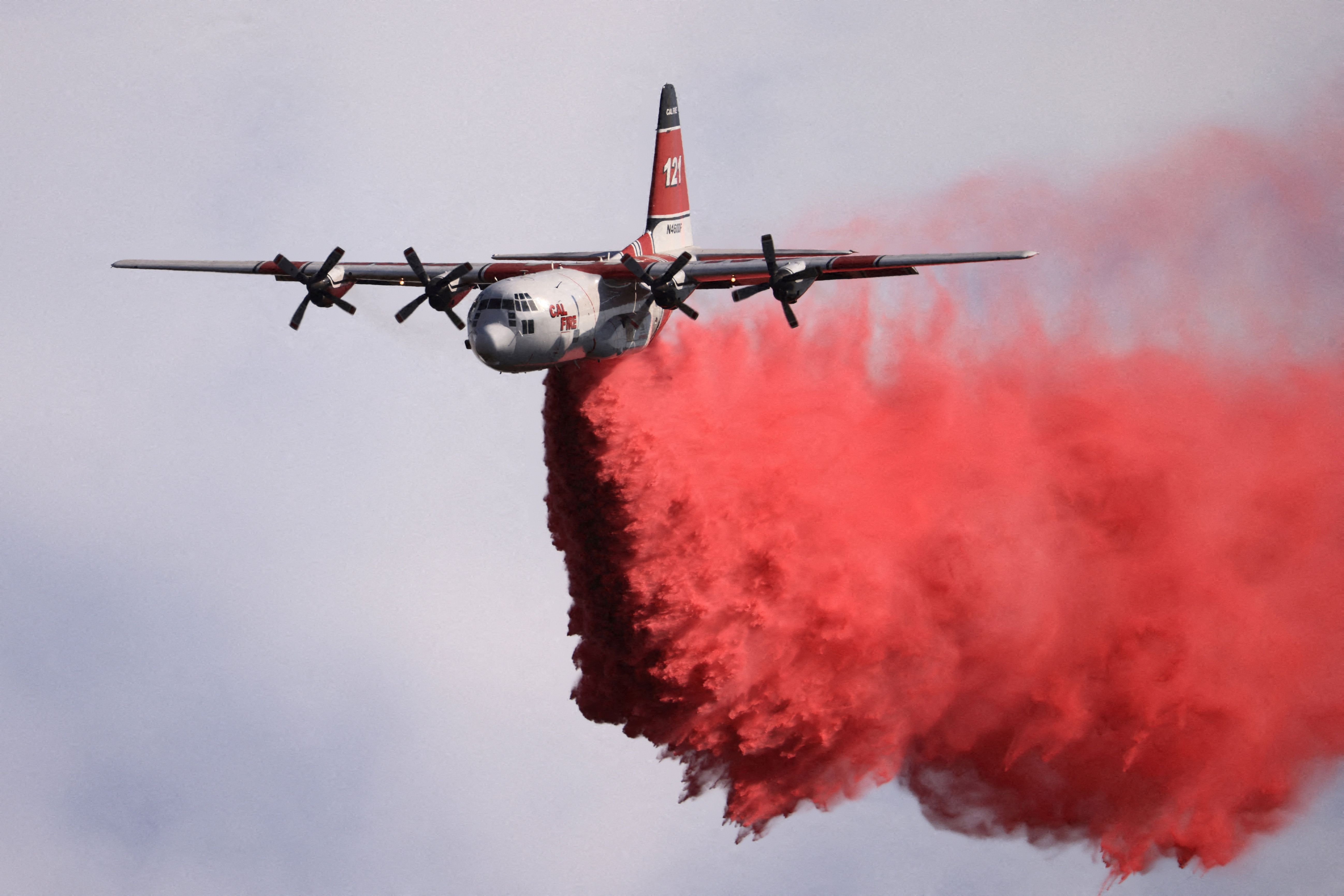 A tanker drops retardant as firefighters battle the Gifford Fire in brush-covered hillsides west of New Cuyama, California on August 5, 2025. (Photo by David Swanson/Reuters)