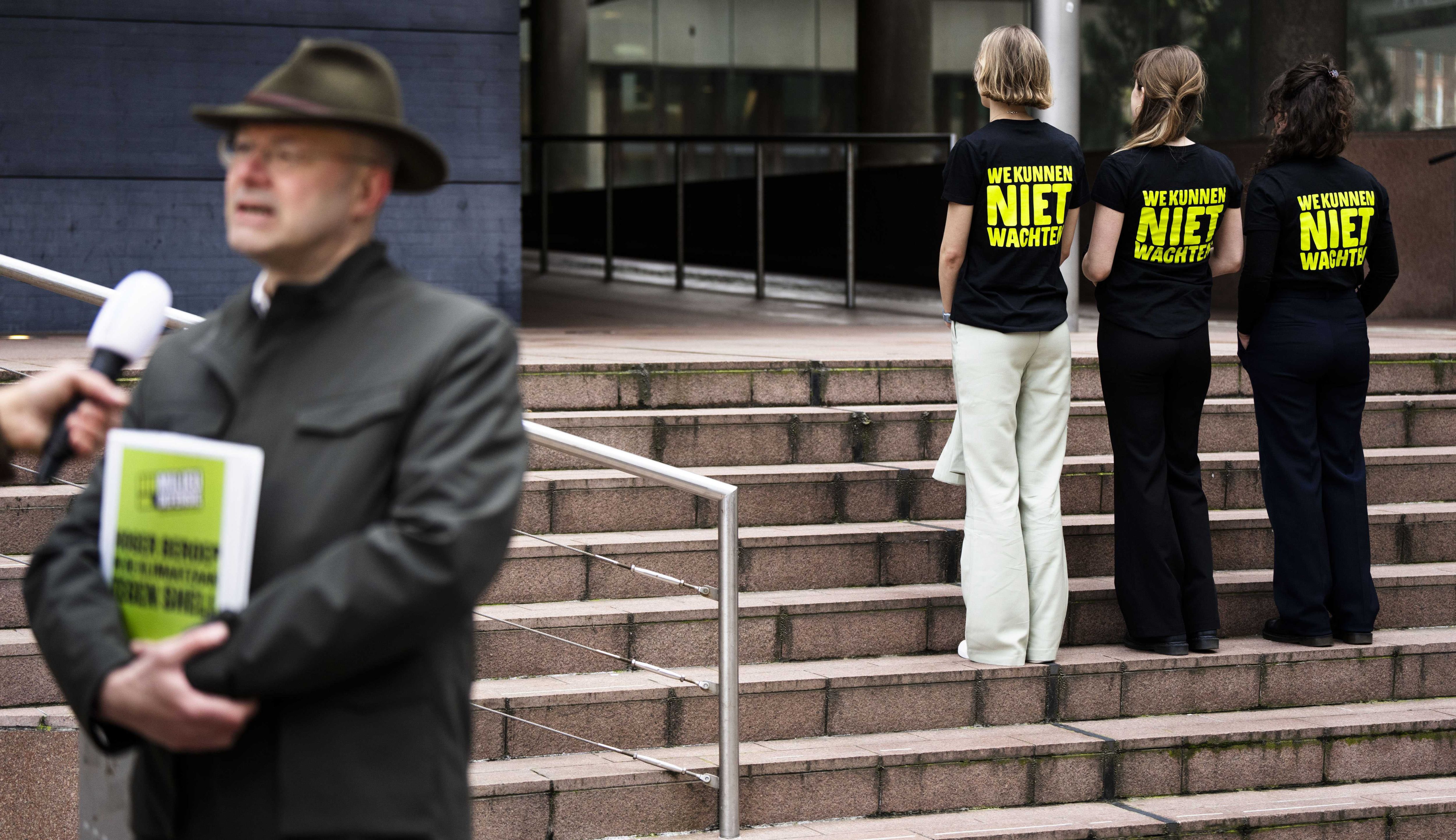 Director Donald Pols of Milieudefensie (L) speaks to the press before the start of the appeal of the climate case that the environmental organization had filed against Shell, in The Hague, The Netherlands, 02 April 2024. Shell appealed against the court's order in 2021 that the oil and gas giant must significantly reduce the CO2 emissions it produces worldwide. (Photo by Freek van den Bergh/EPA)