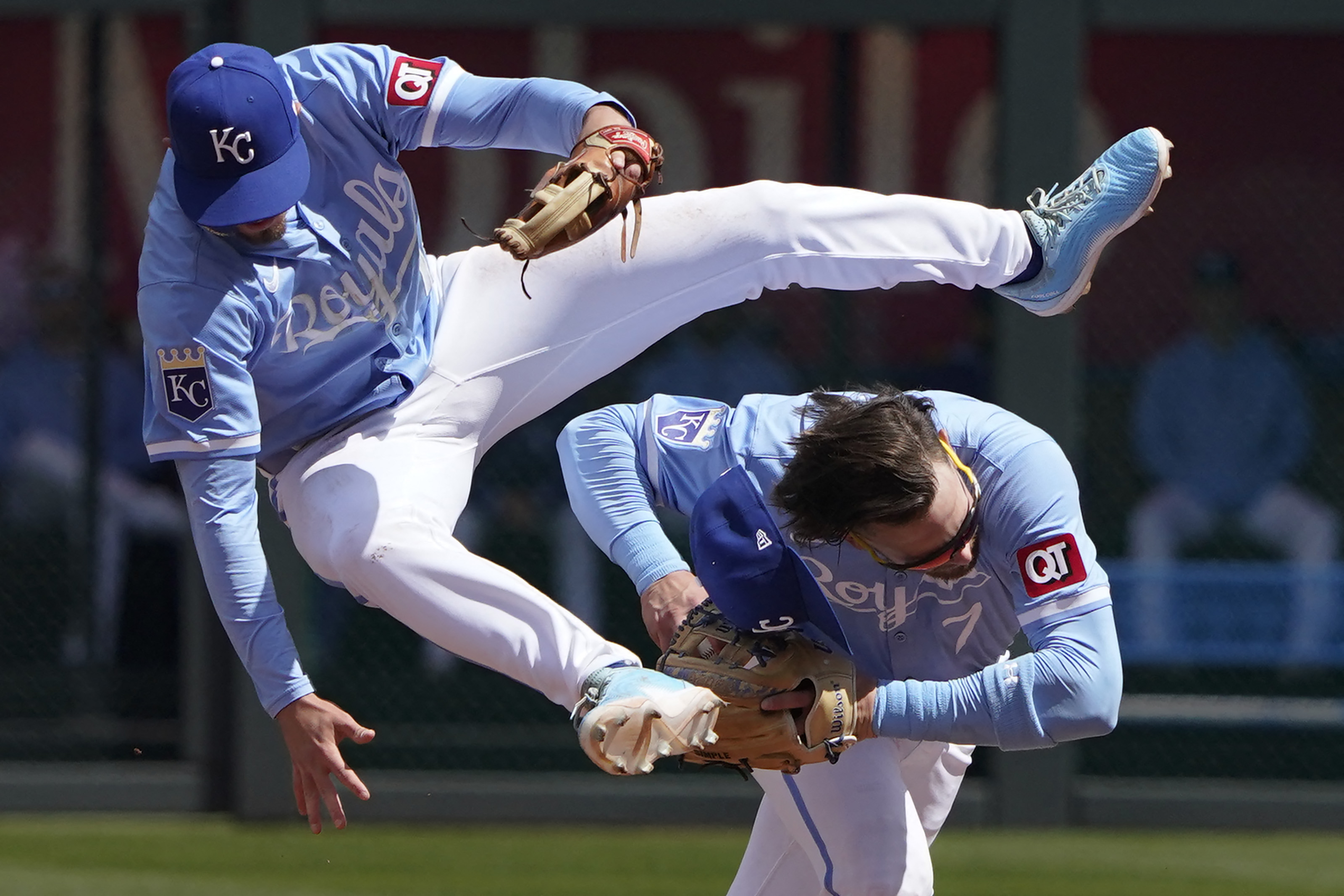 Nick Loftin #12 of the Kansas City Royals leaps over Bobby Witt Jr. #7 as Witt Jr. fields a ball hit by Victor Caratini #17 of the Houston Astros in the fourth inning at Kauffman Stadium on April 11, 2024 in Kansas City, Missouri. (Photo by Ed Zurga/Getty Images/AFP Photo)