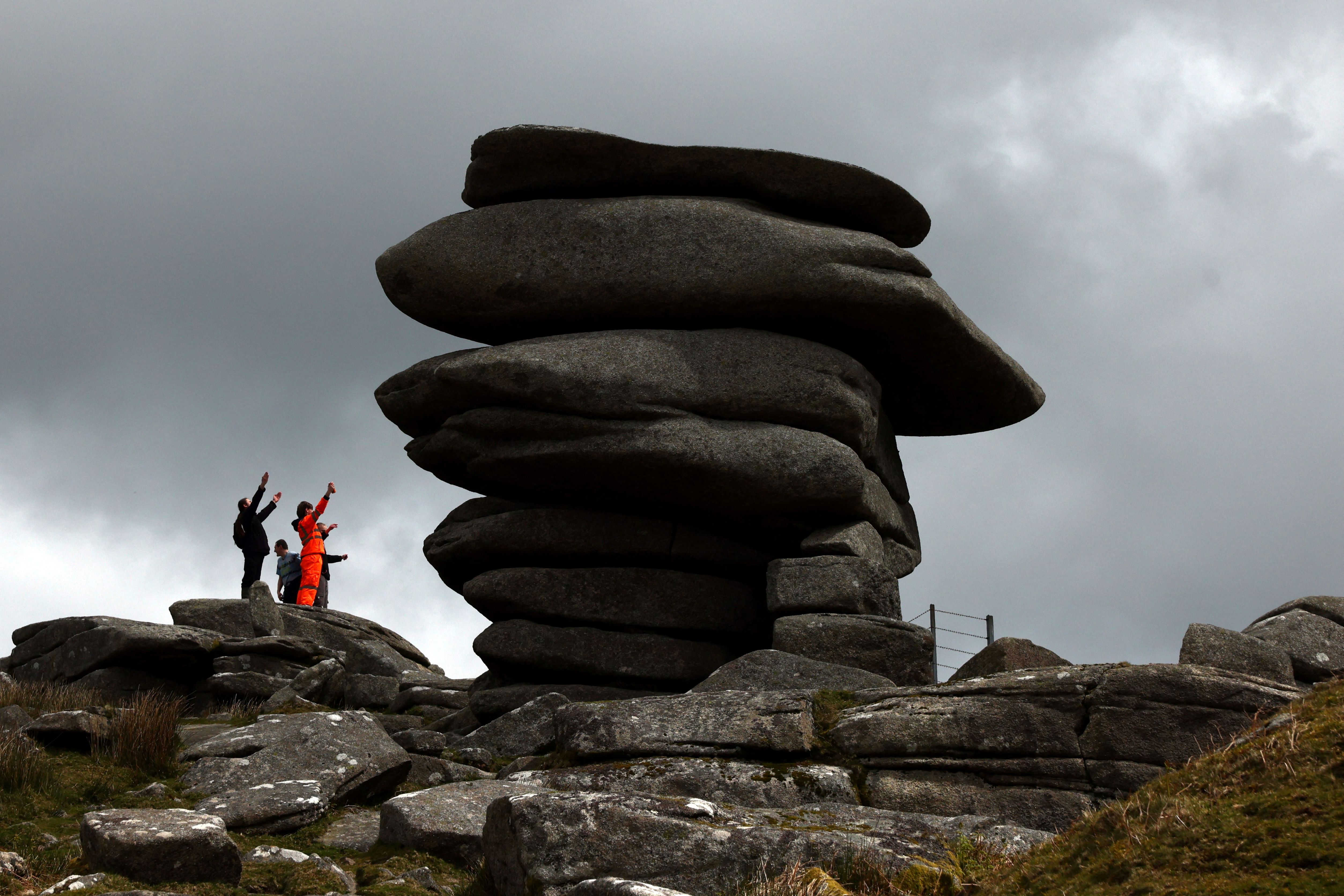 People react as they reach a natural structure known as The Cheesewring on Bodmin Moor, near the village of Minions, Cornwall, Britain on April 24, 2024. (Photo by Kevin Coombs/Reuters)