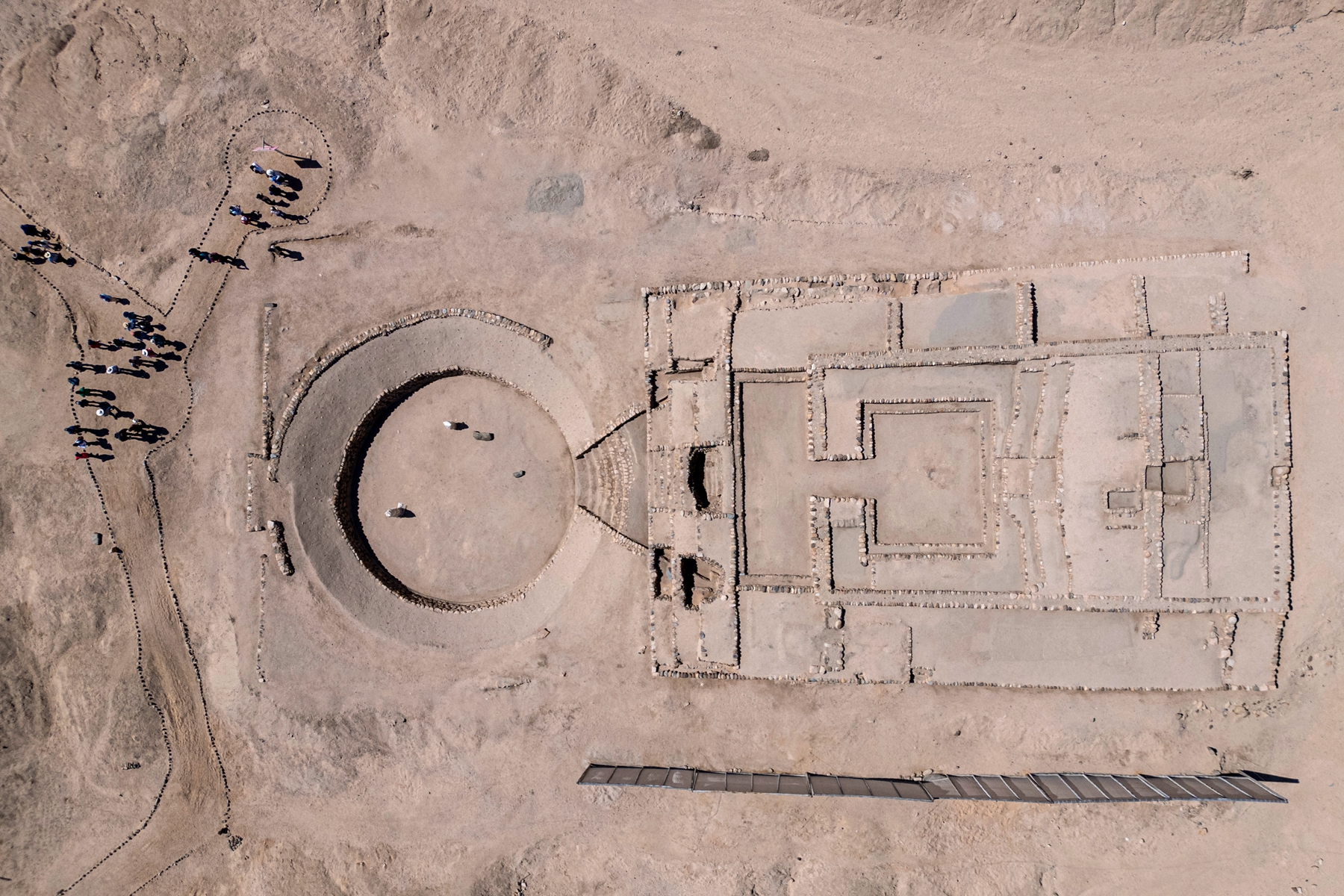 Aerial view of the citadel of Penico, located in the province of Huaura, Lima Department, Peru, on July 12, 2025. A 3,800-year-old citadel from the Caral civilization, one of the oldest in the world and located in northern Peru, has opened its doors to the public after eight years of scientific studies and restoration work. (Photo by Ernesto Benavides/AFP Photo)