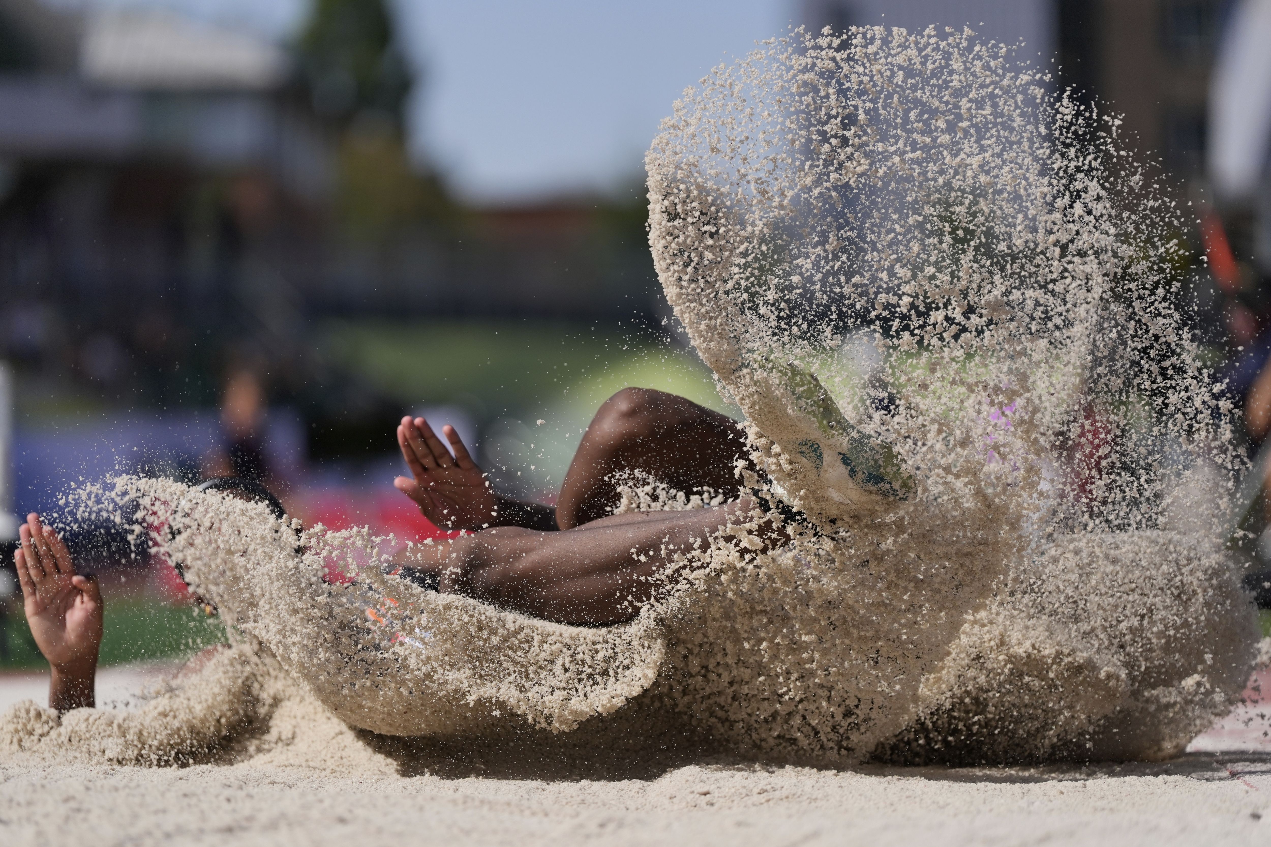 Malcolm Clemons competes in the men's long jump finals during the U.S. Championships athletics meet in Eugene, Ore.,Friday, August 1, 2025. (Photo by Ashley Landis/AP Photo)