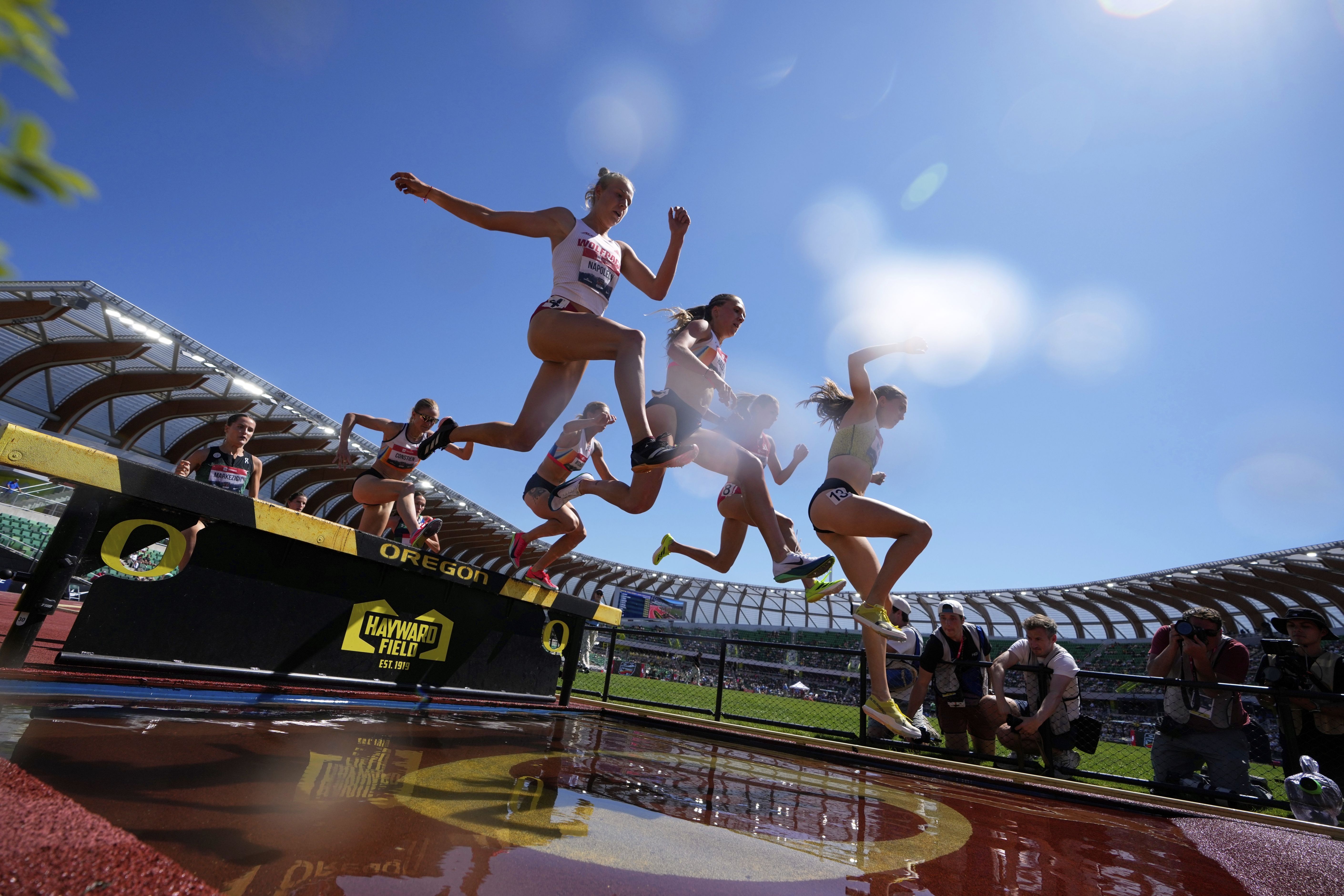 Runners compete in the women's 300-meter steeplechase finals during the U.S. Championships athletics meet in Eugene, Ore.,Saturday, August 2, 2025. (Photo by Ashley Landis/AP Photo)