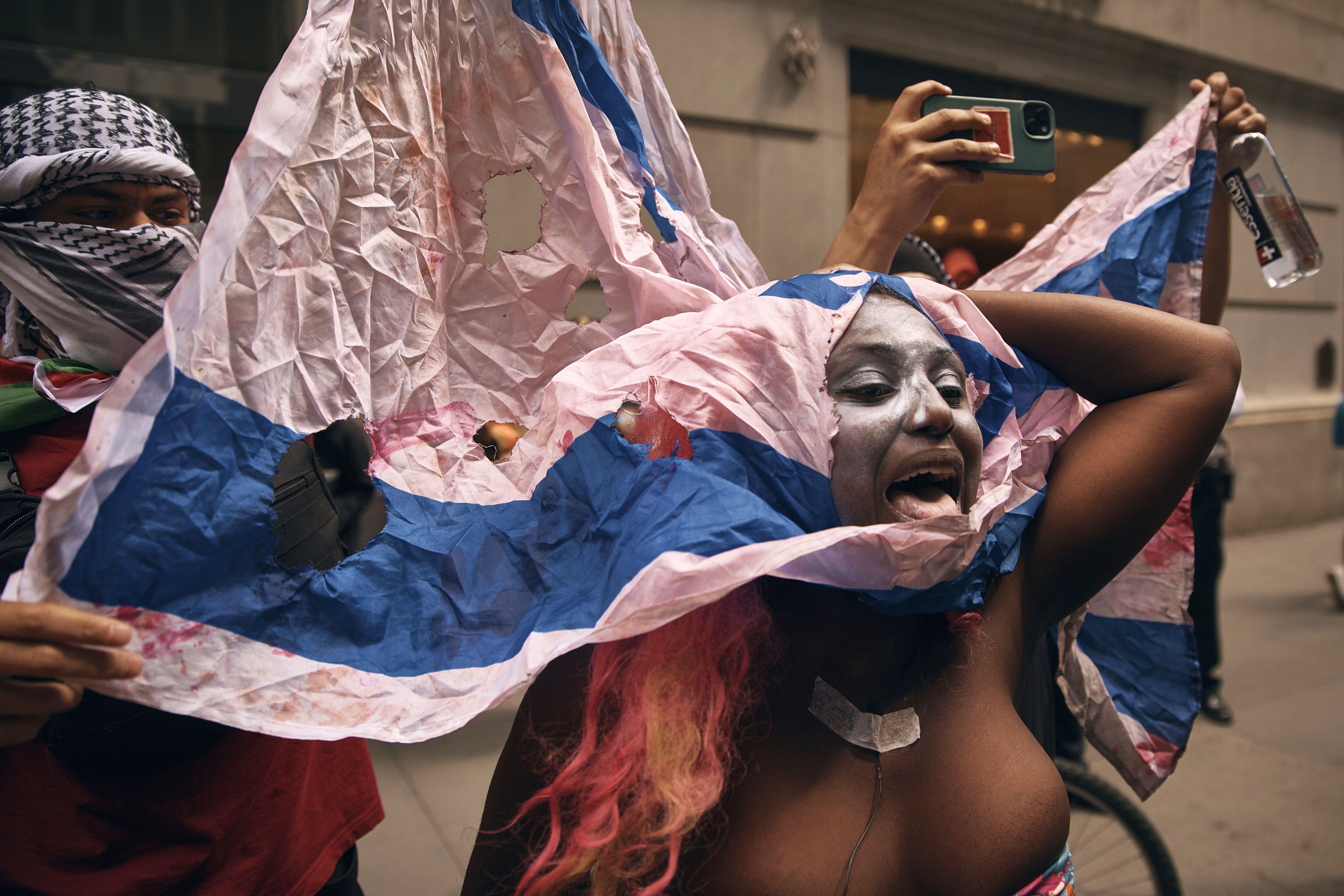 A Pro-Palestinian demonstrator dons a defaced Israeli flag during a protest calling for an economic blockade and demanding a cease-fire on the Israel-Palestinian conflict, outside the New York Stock Exchange, April 15, 2024. (Photo by Andres Kudacki/AP Photo)
