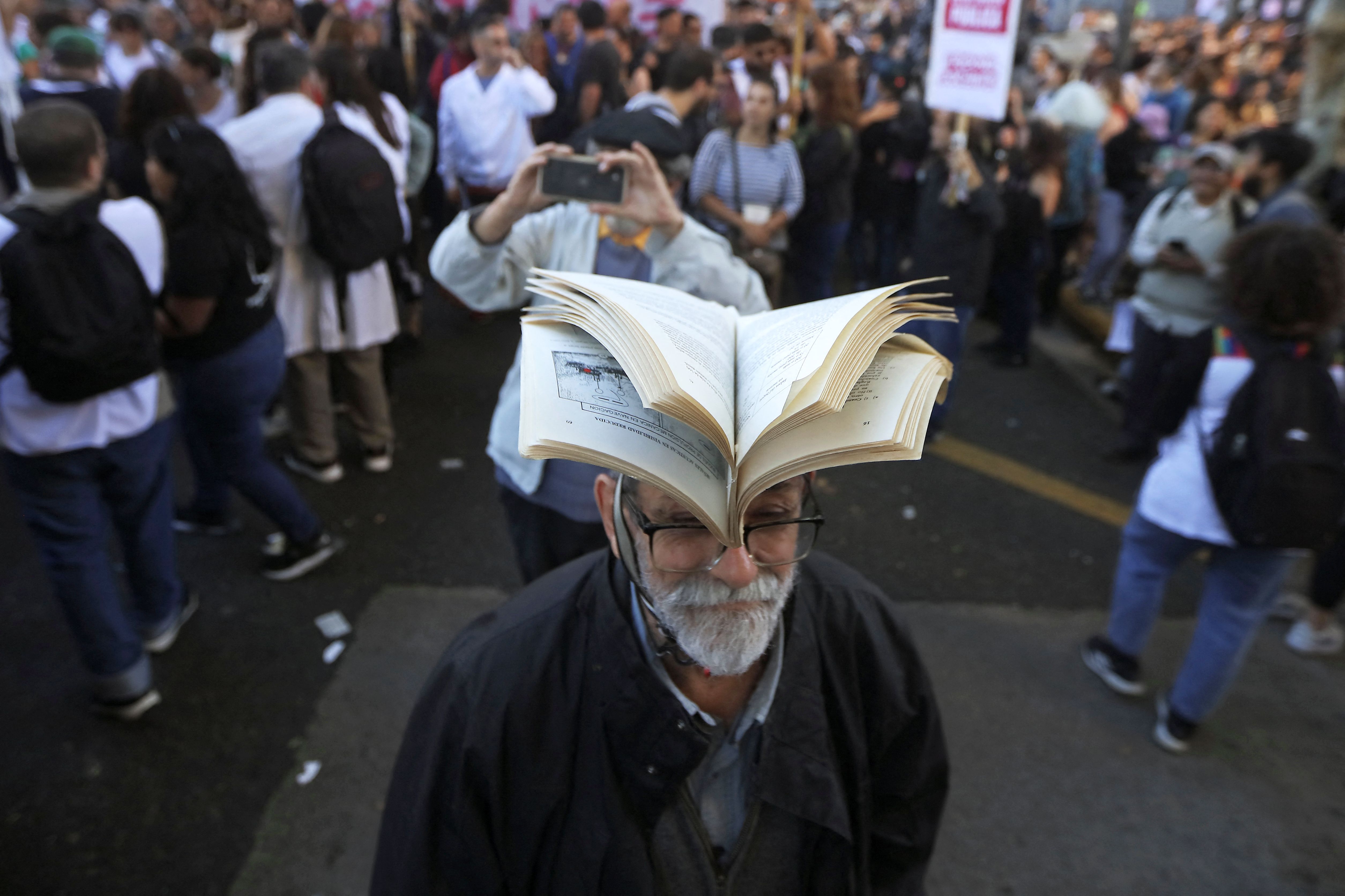 A man bears a book on his head during a march in protest of the budget adjustment to public universities in Buenos Aires on April 23, 2024. Tens of thousands of Argentine university students took to the streets Tuesday to protest cuts to higher public education, research and science under budget-slashing new President Javier Milei. (Photo by Emiliano Lasalvia/AFP Photo)