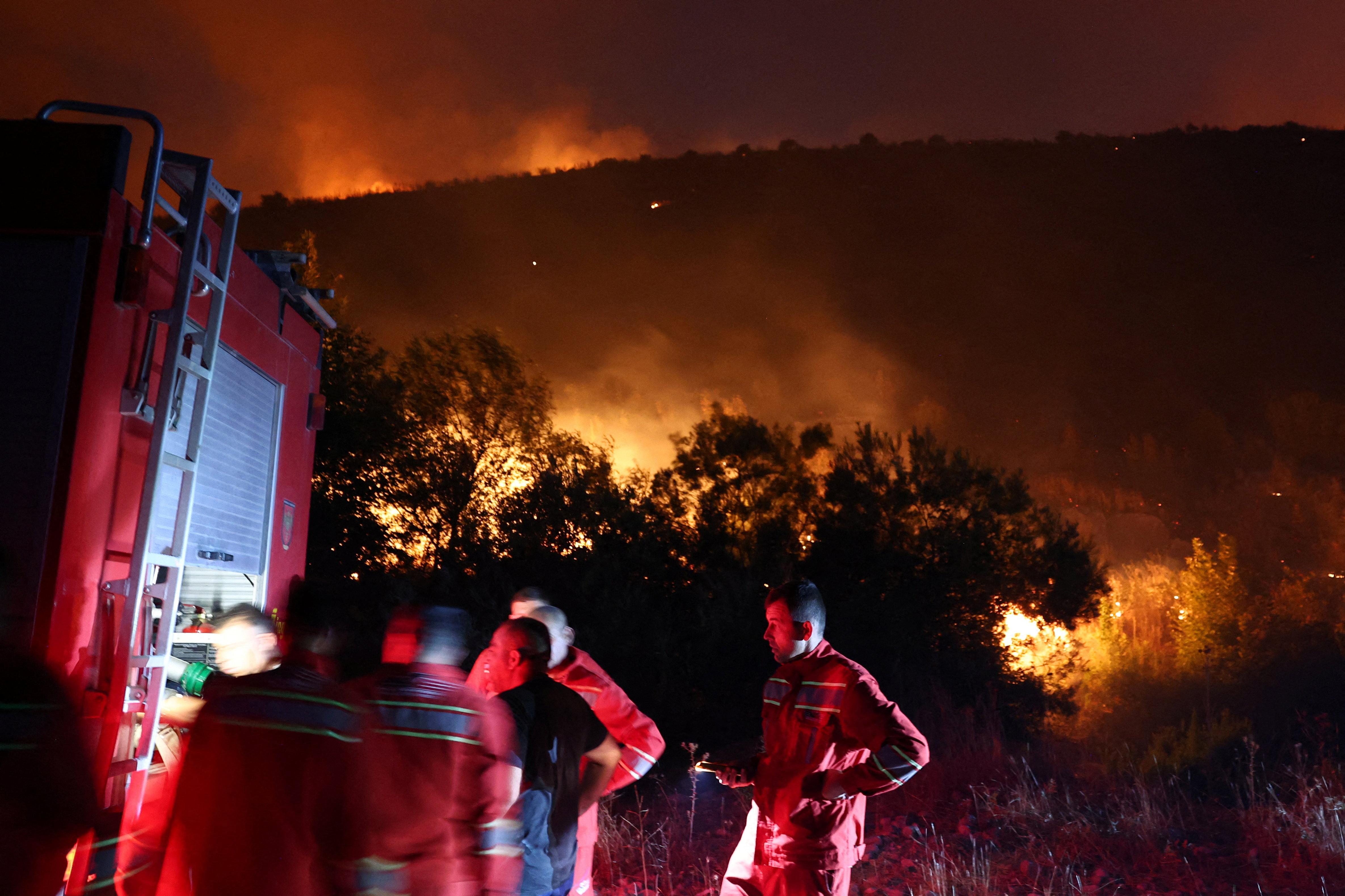 Members of emergency services work to contain a wildfire in Kalas, Delvina, Albania, on July 27, 2025. (Photo by Florion Goga/Reuters)