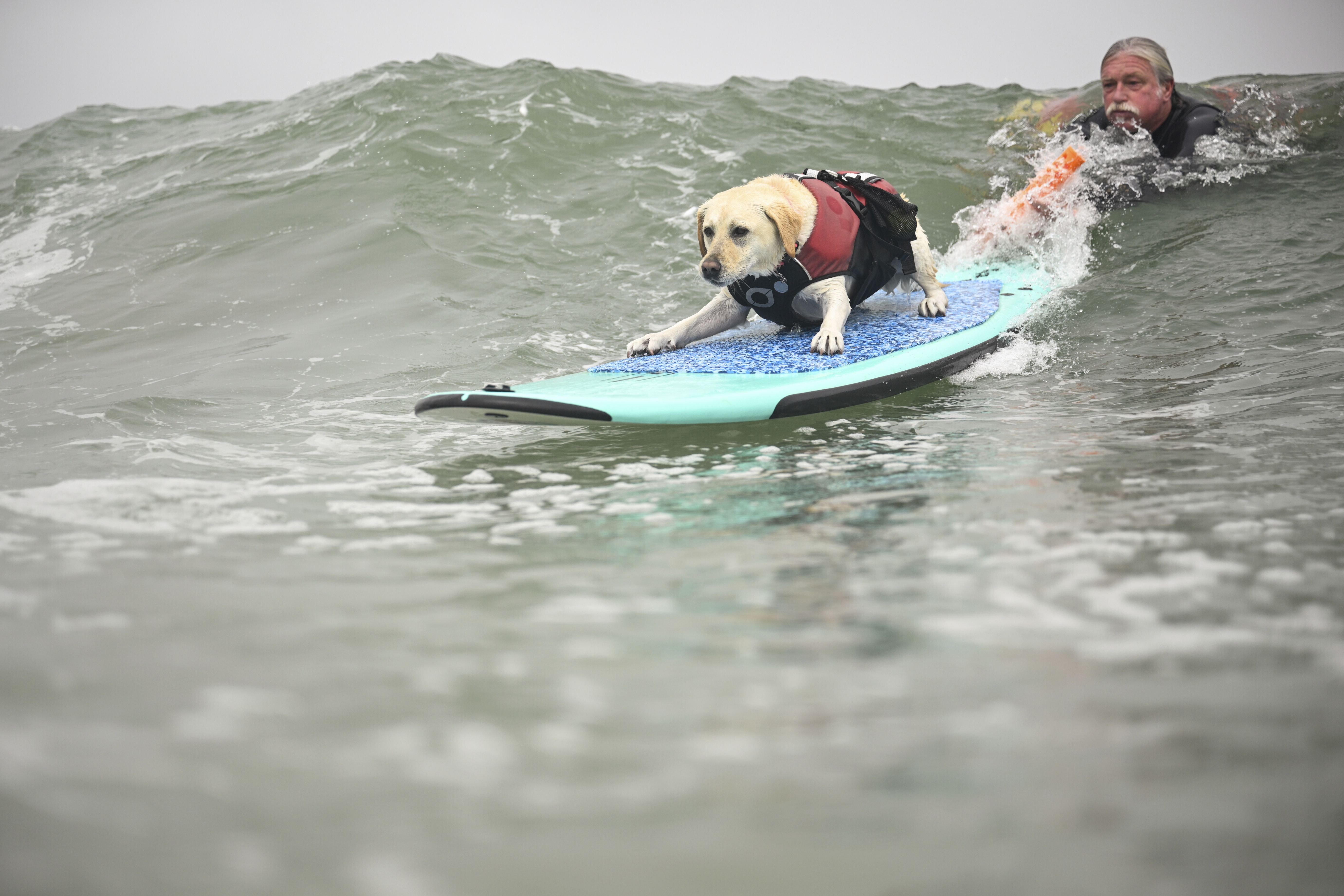 Steve Drottar helps Rosie catch a wave during the World Dog Surfing Championships Saturday, August 2, 2025, in Pacifica, Calif. (Photo by Eakin Howard/AP Photo)