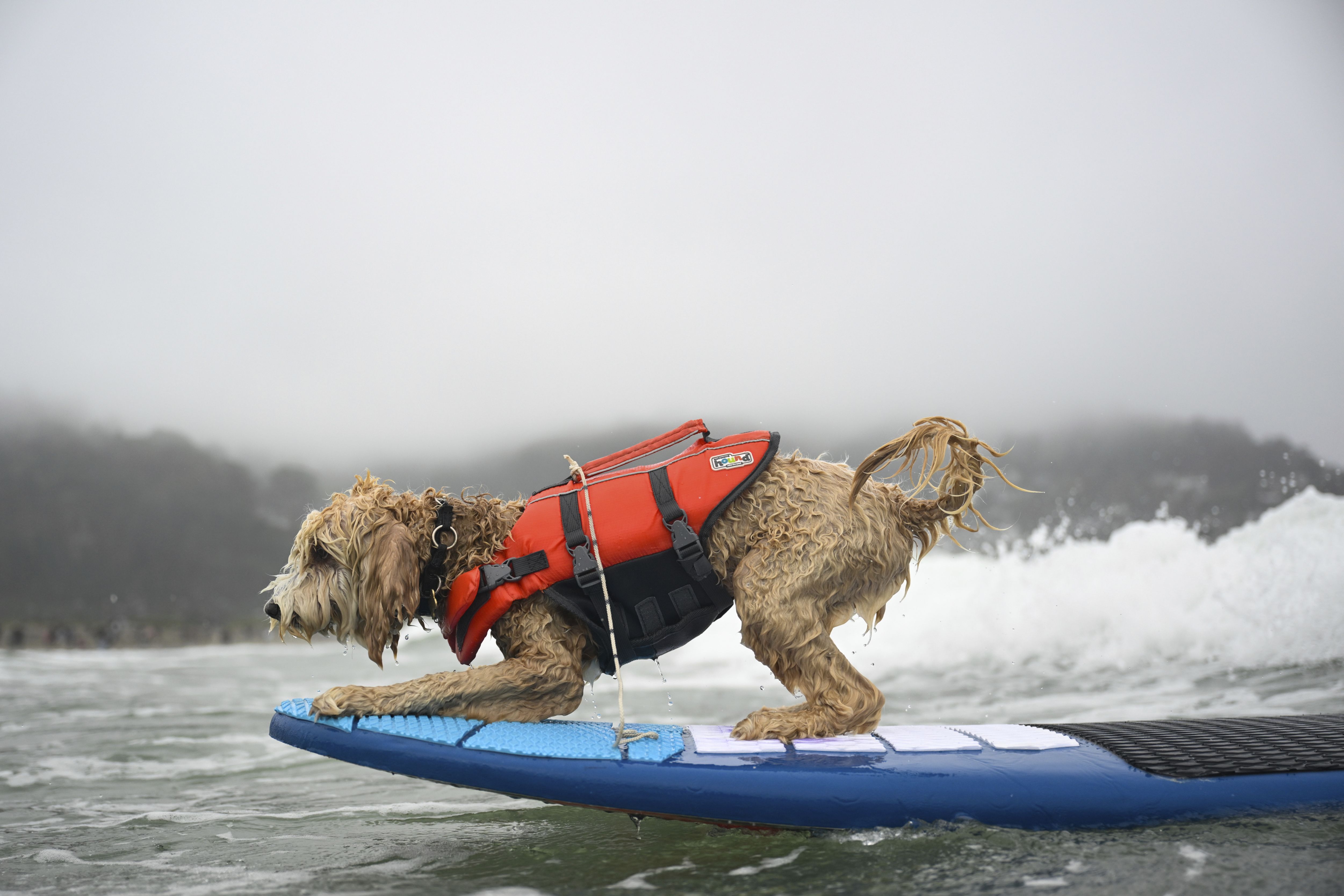 Coconut catches a wave during the World Dog Surfing Championships Saturday, August 2, 2025, in Pacifica, Calif. (Photo by Eakin Howard/AP Photo)