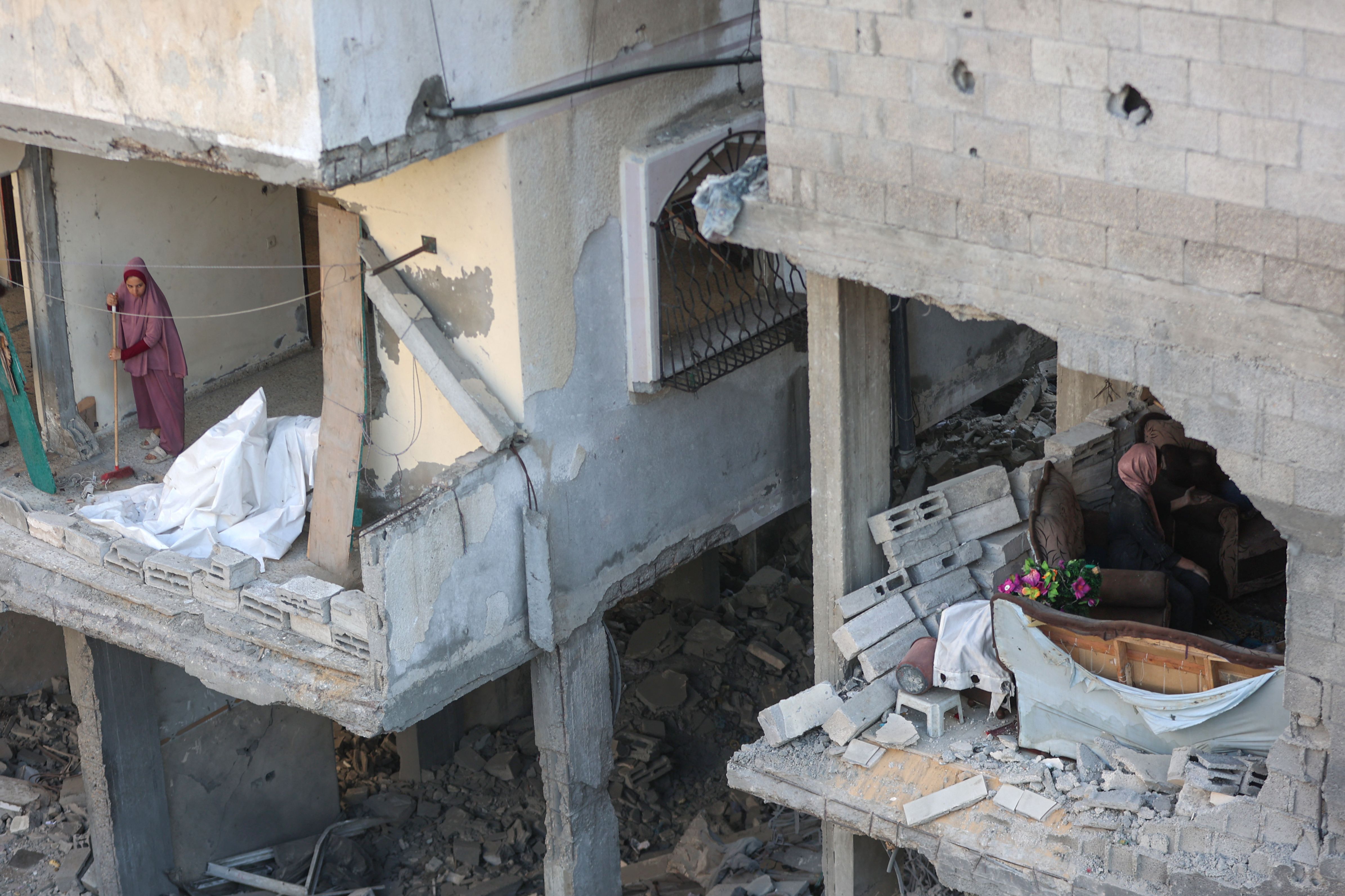 A Palestinian woman clears debris from her home as he neighbour inspects the damage after an Israeli strike on the Al-Shati refugee camp, west of Gaza City, on July 9, 2025. (Photo by Omar Al-Qattaa/AFP Photo)