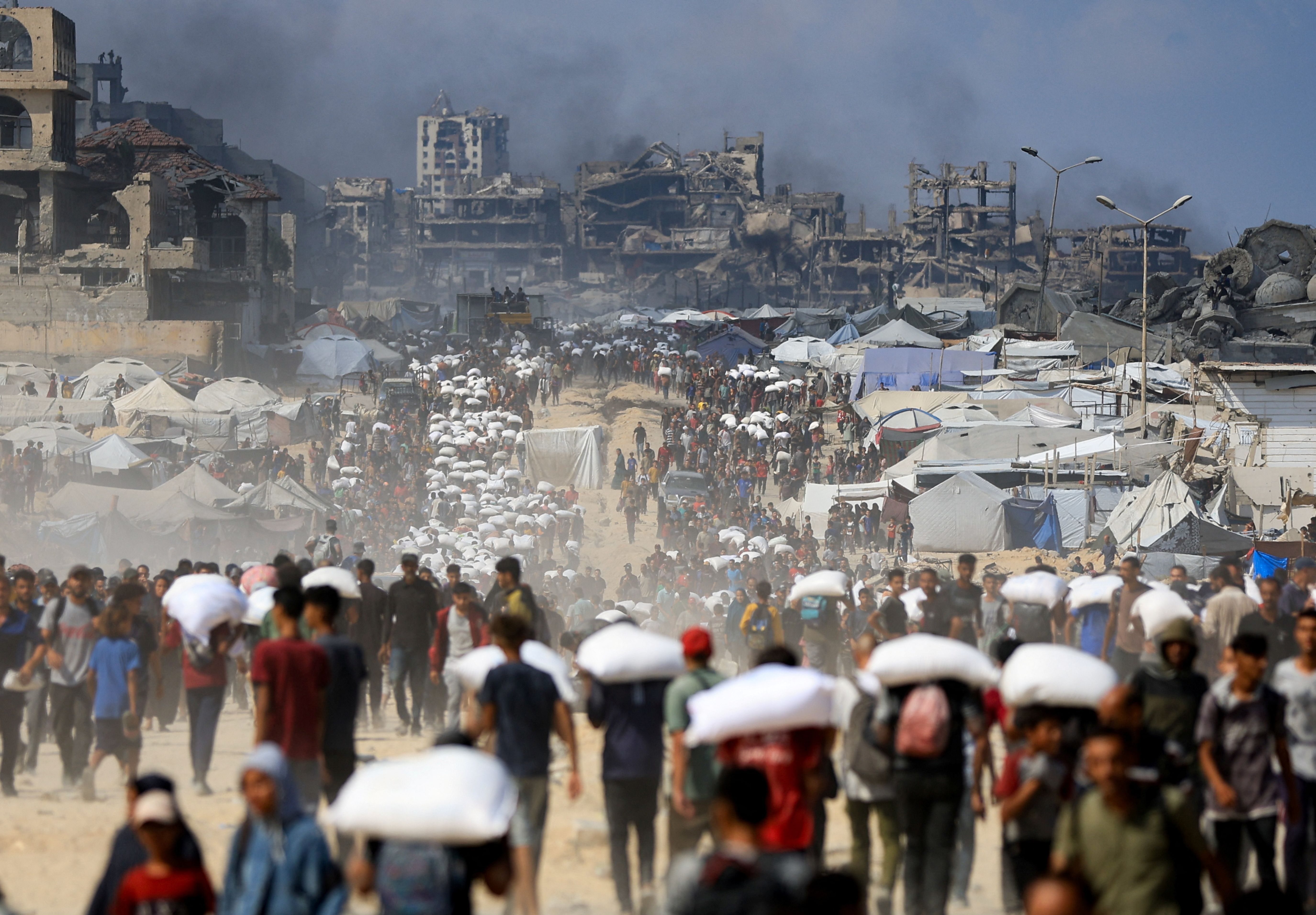 Palestinians gather as they carry aid supplies that entered Gaza through Israel, amid a hunger crisis, in Beit Lahia in the northern Gaza Strip on July 20, 2025. (Photo by Dawoud Abu Alkas/Reuters)
