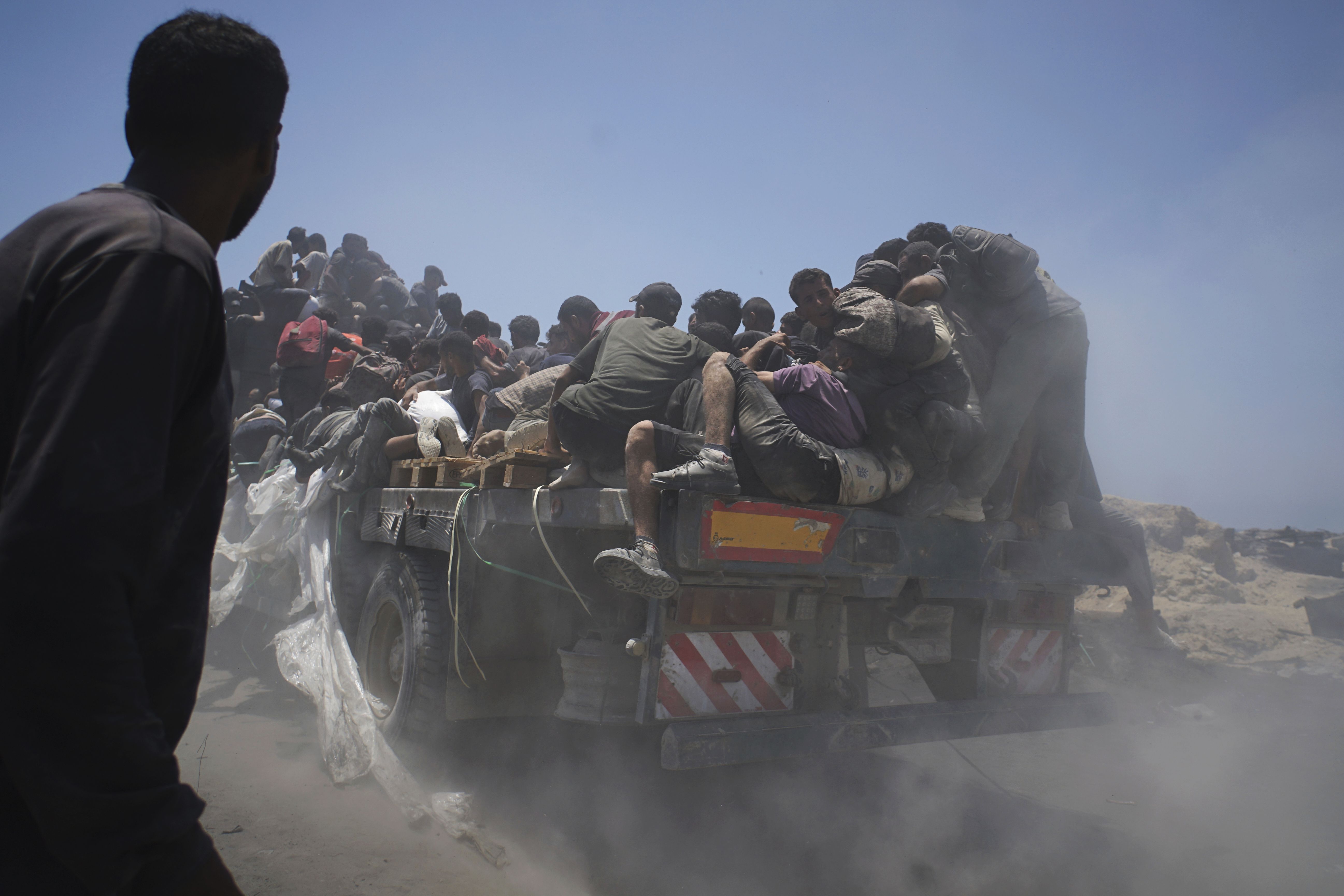 Palestinians hold onto an aid truck returning to Gaza City from the northern Gaza Strip on Tuesday, July 22, 2025. (Photo by Jehad Alshrafi/AP Photo)