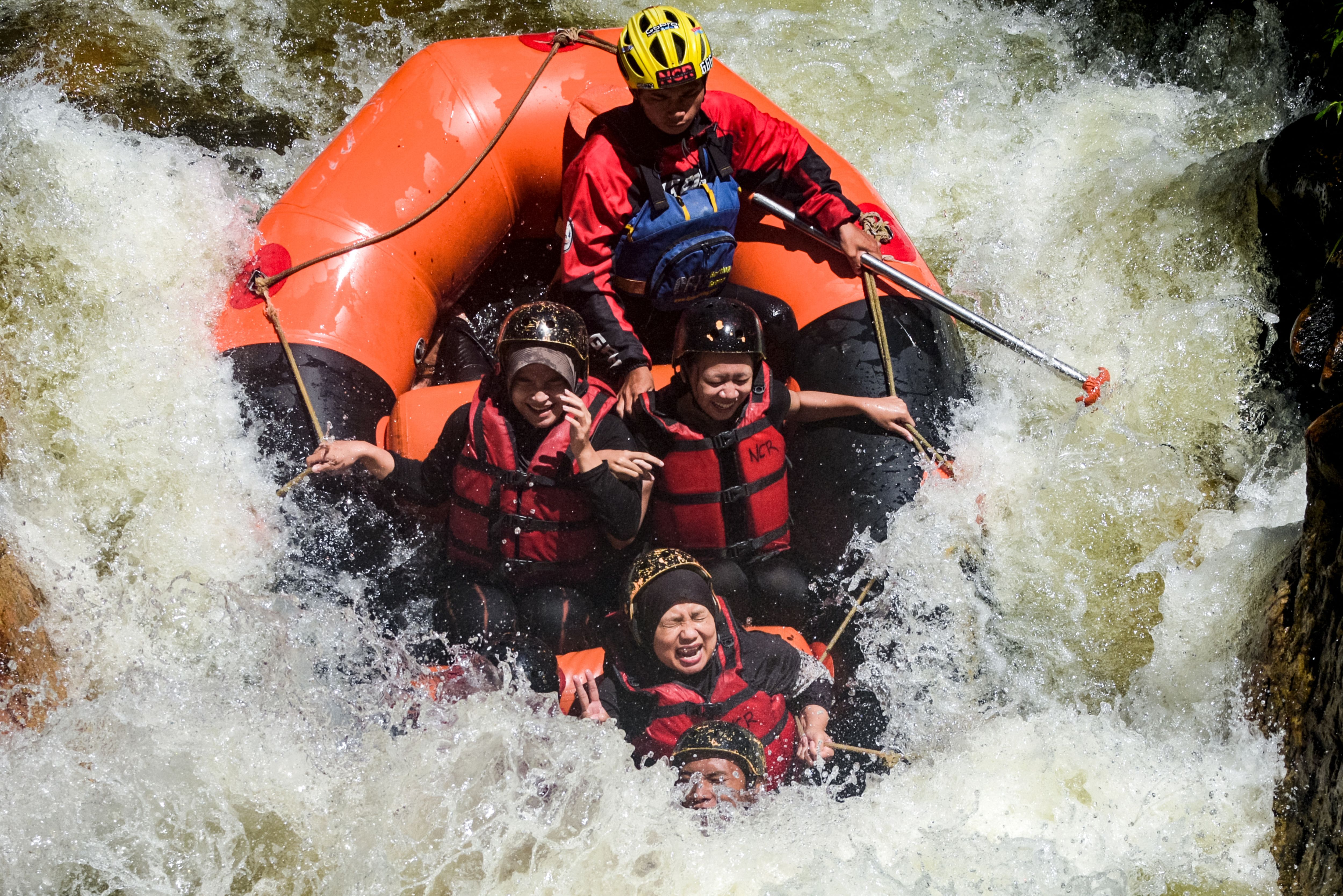Local tourists enjoy white water rafting across river Palayangan in the Pangalengan district of Bandung, West Java on June 8, 2025. (Photo by Timur Matahari/AFP Photo)