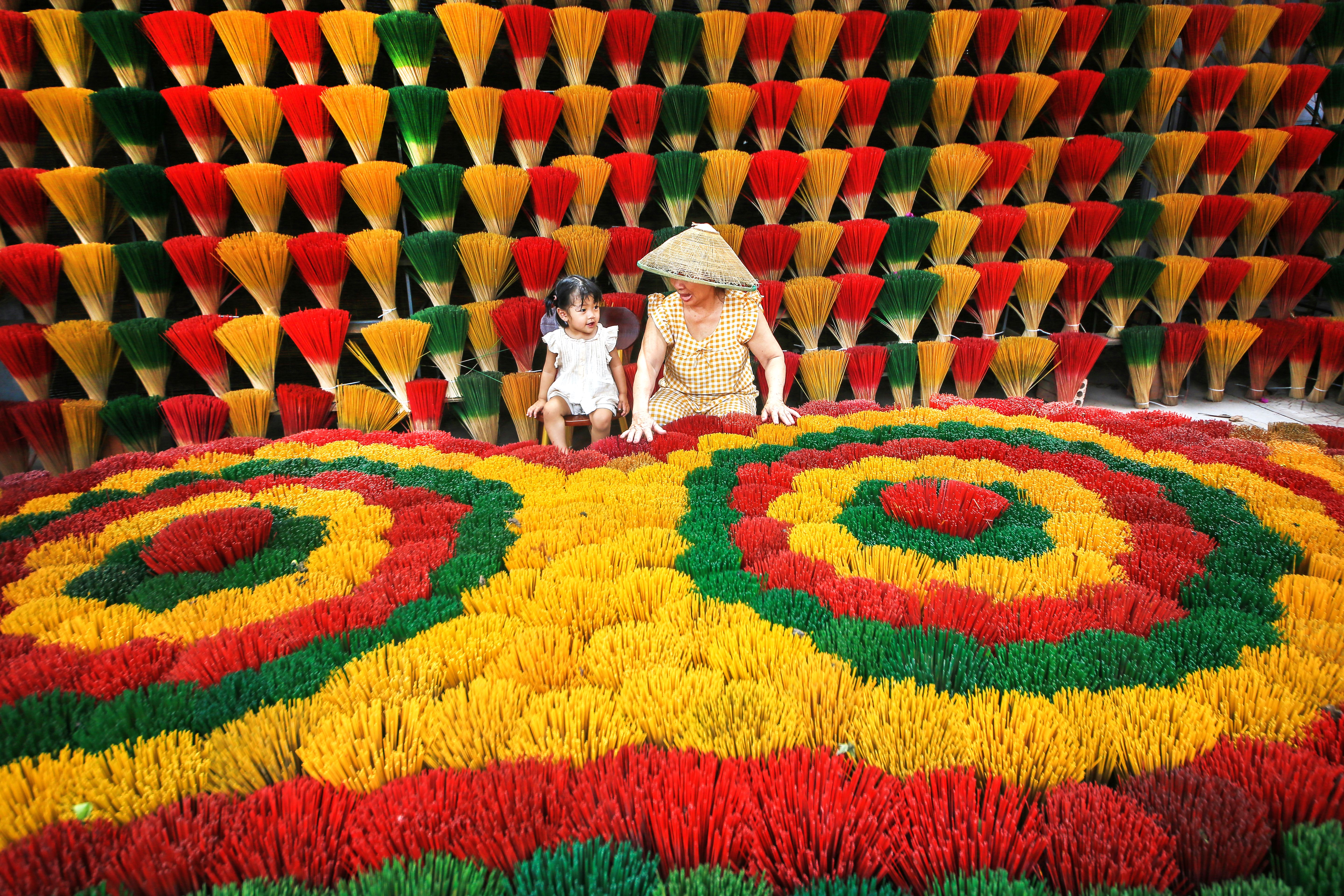 A view of colorful incenses, traditionally produced at the Thuy Xuan Incense-making Village, in the central province of Thua Thien Hue, Vietnam on July 06, 2025. The village has been preserving the tradition of incense making for over 700 years. Once producing incense for royal palaces and local communities, the village has now become a popular destination for both domestic and international visitors. The incense sticks, made from natural ingredients such as agarwood, cinnamon, clove, and pine resin, stand out for their pure aromas free from chemical additives. After the bamboo sticks are sun-dried, a natural mixture is carefully applied, creating incense used in both religious rituals and daily life. The colorful bundles of incense sticks left to dry in the villagefeaturing dominant shades of green, red, purple, and yellowresemble a vibrant flower garden. Tourists visiting the village can observe the entire production process, from drying the bamboo sticks in the sun to applying the mixture, and even try making their own incense if they wish. (Photo by Ummu Nisan Kandilcioglu/Anadolu via Getty Images)