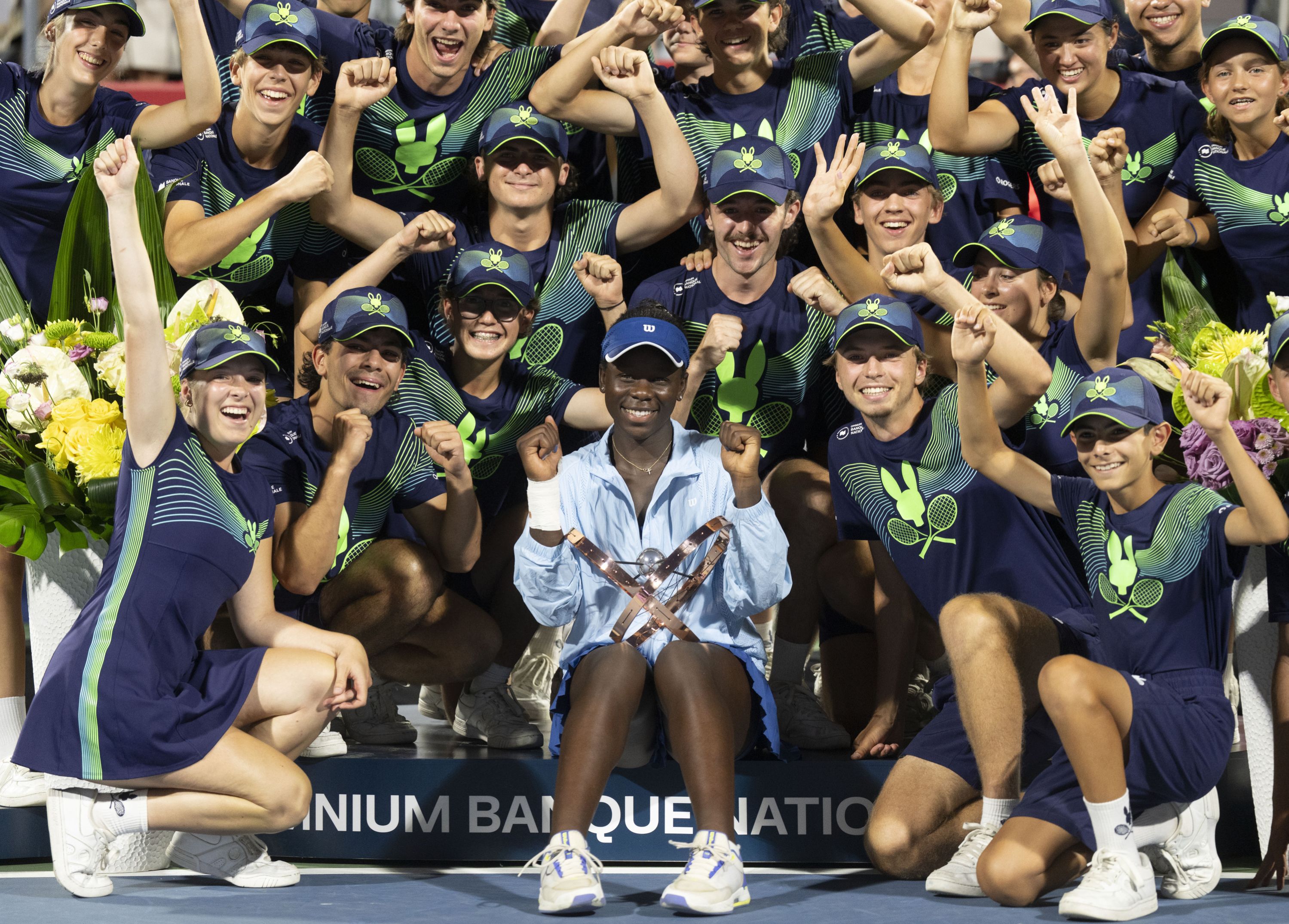 Victoria Mboko, center front, of Canada, poses with the ball crew following her win over Naomi Osaka, of Japan, in final action at the National Bank Open women's tennis tournament in Montreal, Thursday, August 7, 2025. (Photo by Christinne Muschi/The Canadian Press via AP Photo)