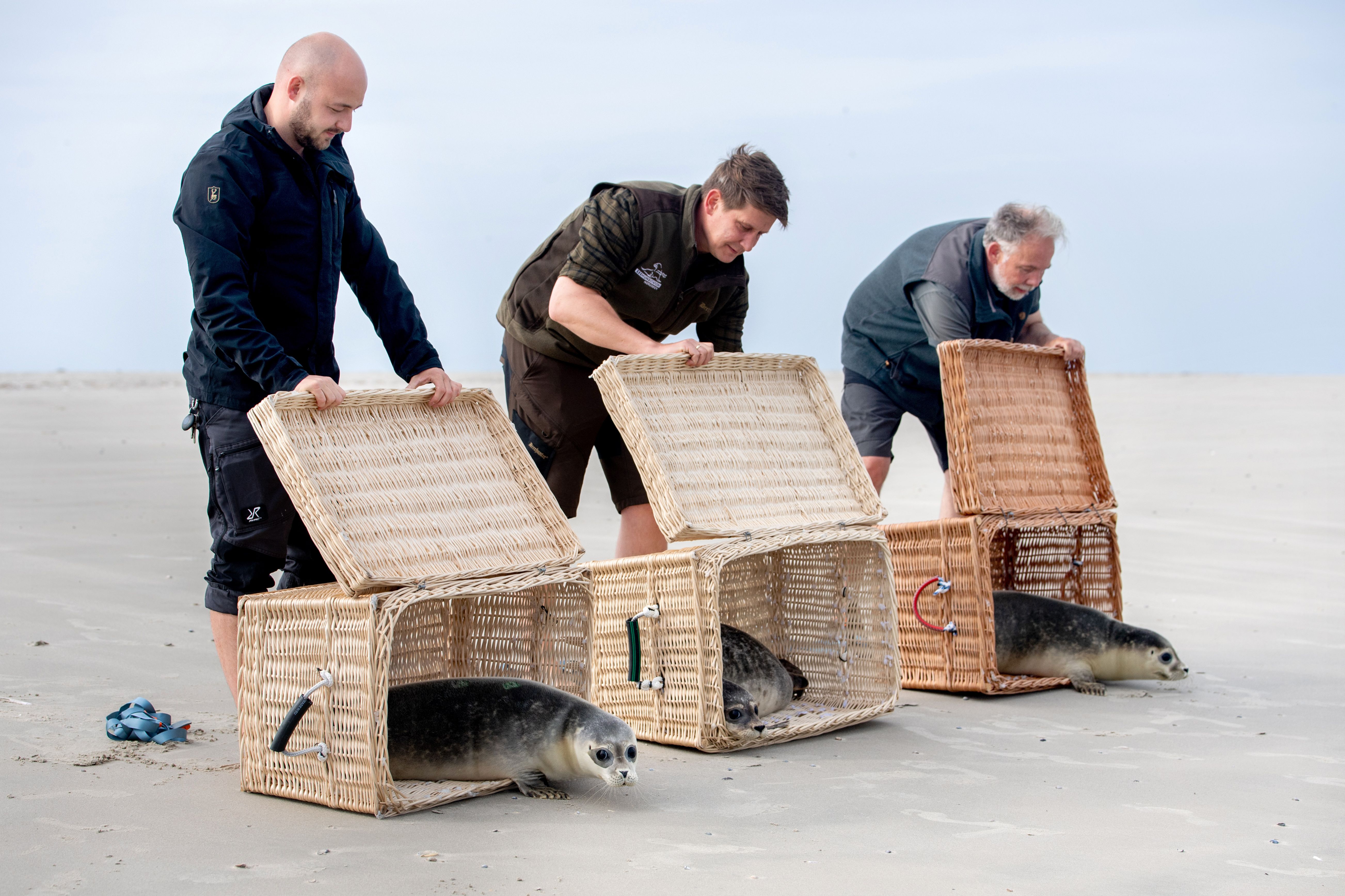 Fabian Gathmann, Tim Fetting, and Peter Lienau of the Norddeich seal station in Germany watch on August 7, 2025 as seals Hubi, Steve, and Scotty are released into the wild at the eastern end of Juist Island following successful rehabilitation. (Photo by Hauke-Christian Dittrich/Avalon)