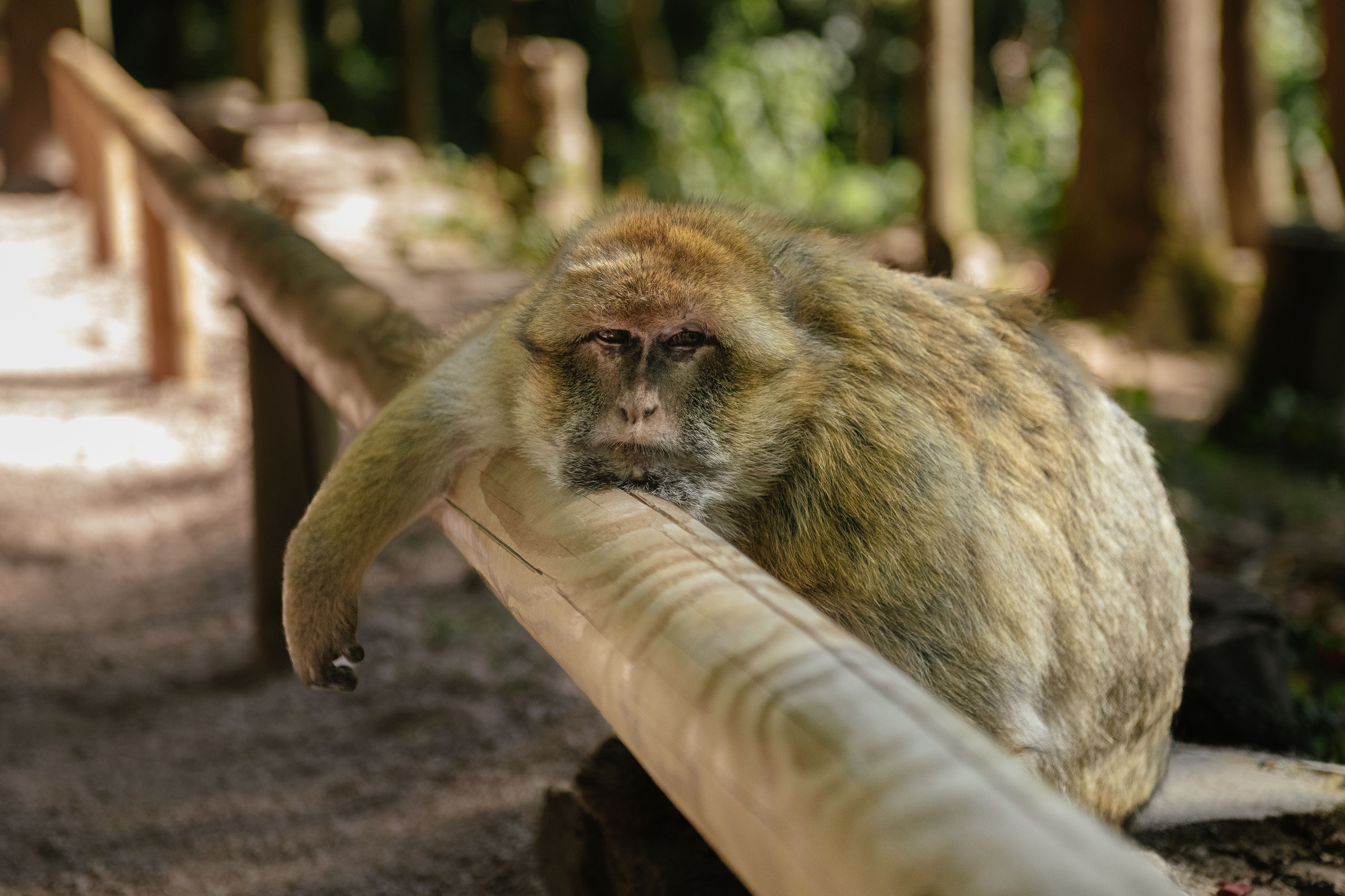 A Barbary macaque is seen at the Montagne des Singes (Monkey Mountain), which stands out as a unique place to visit for nature and animal lovers on July 22, 2025 near the Kintzheim of Alsace, France. The open-air park, located on approximately 24 hectares of forest, is home to over 200 Barbary macaque monkeys. The macaques roam completely freely in the park, which gives visitors the opportunity to observe the animals in their natural habitat. Offering an educational and entertaining route for families and children, Montagne des Singes also stands out with its efforts to protect the endangered Barbary macaque. For those who want to have direct contact with natural life, Monkey Mountain is among the must-see locations in France. (Photo by Mehmet Aslan/Anadolu via Getty Images)