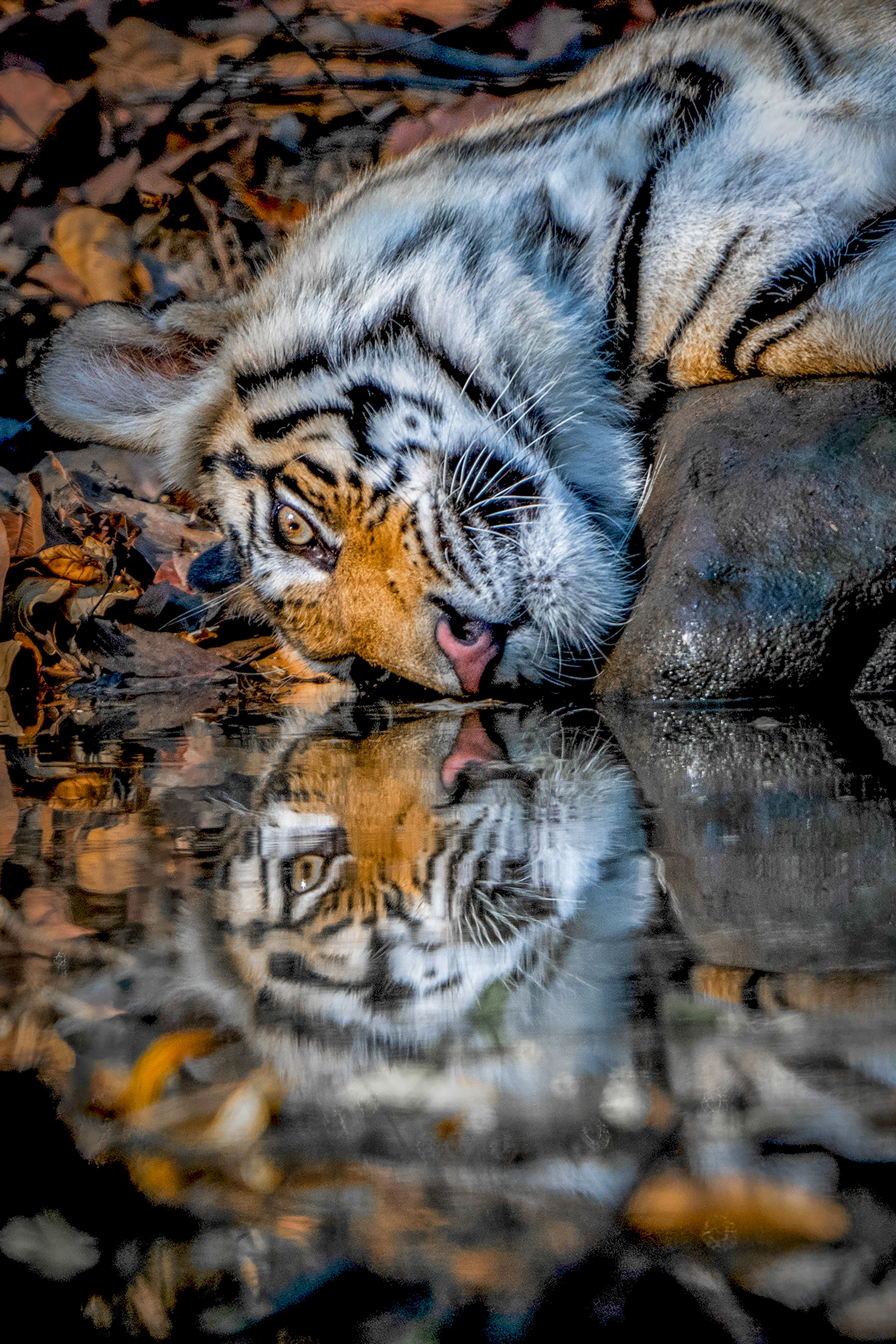 A young Bengal tiger takes some time to reflect in Bandhavgarh National Park, India in the first decade of August 2025. (Photo by Bircan Harper/Solent News & Photo Agency)