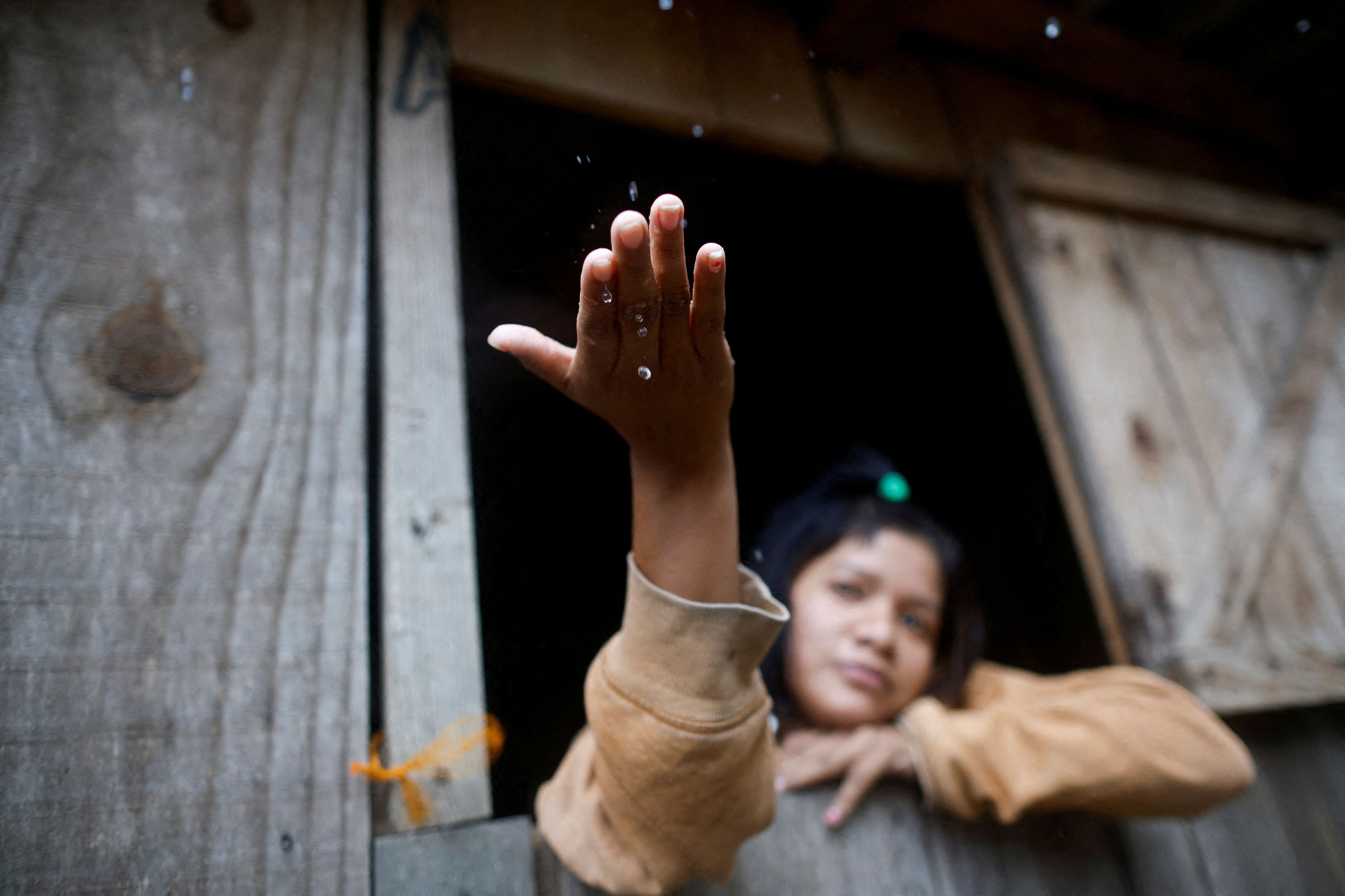 Pailona Ramirez from Guarani people looks on during rain at Pindo Poty village after it was flooded, in Porto Alegre, Rio Grande do Sul state, Brazil on May 13, 2024. (Photo by Adriano Machado/Reuters)
