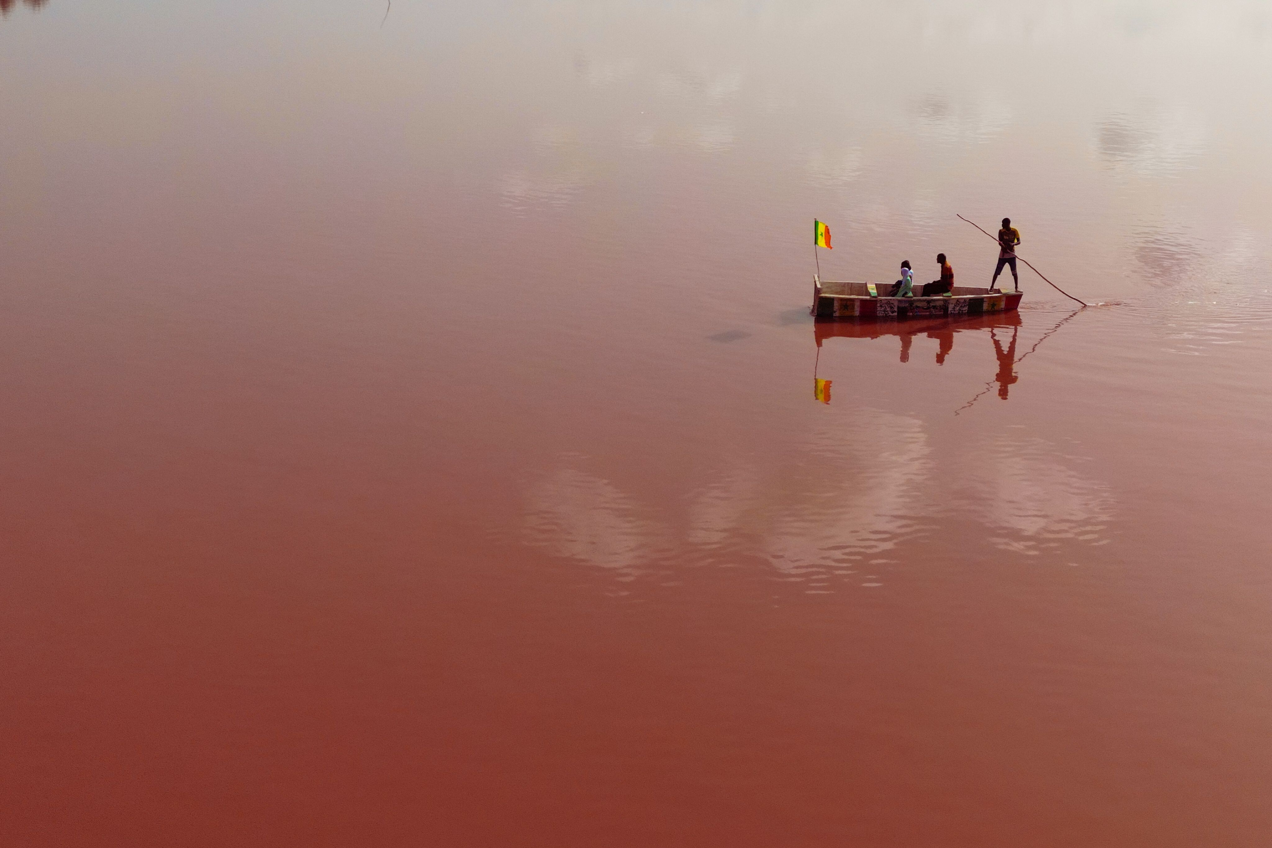 A boat sails on the Lake Retba, around 35 kilometers away from Dakar in Senegal, on July 3, 2025. Lake Retba, also known as The Pink Lake, which lost its color due to excessive rainfall in Senegal, has regained its color after a long period of pollution-induced fading. The lake, which is among the saltiest lakes in the world and turns pink thanks to the algae named 'Dunaliella salina', is important for both tourism and the economy of the region. (Photo by Cem Ozdel/Anadolu via Getty Images)