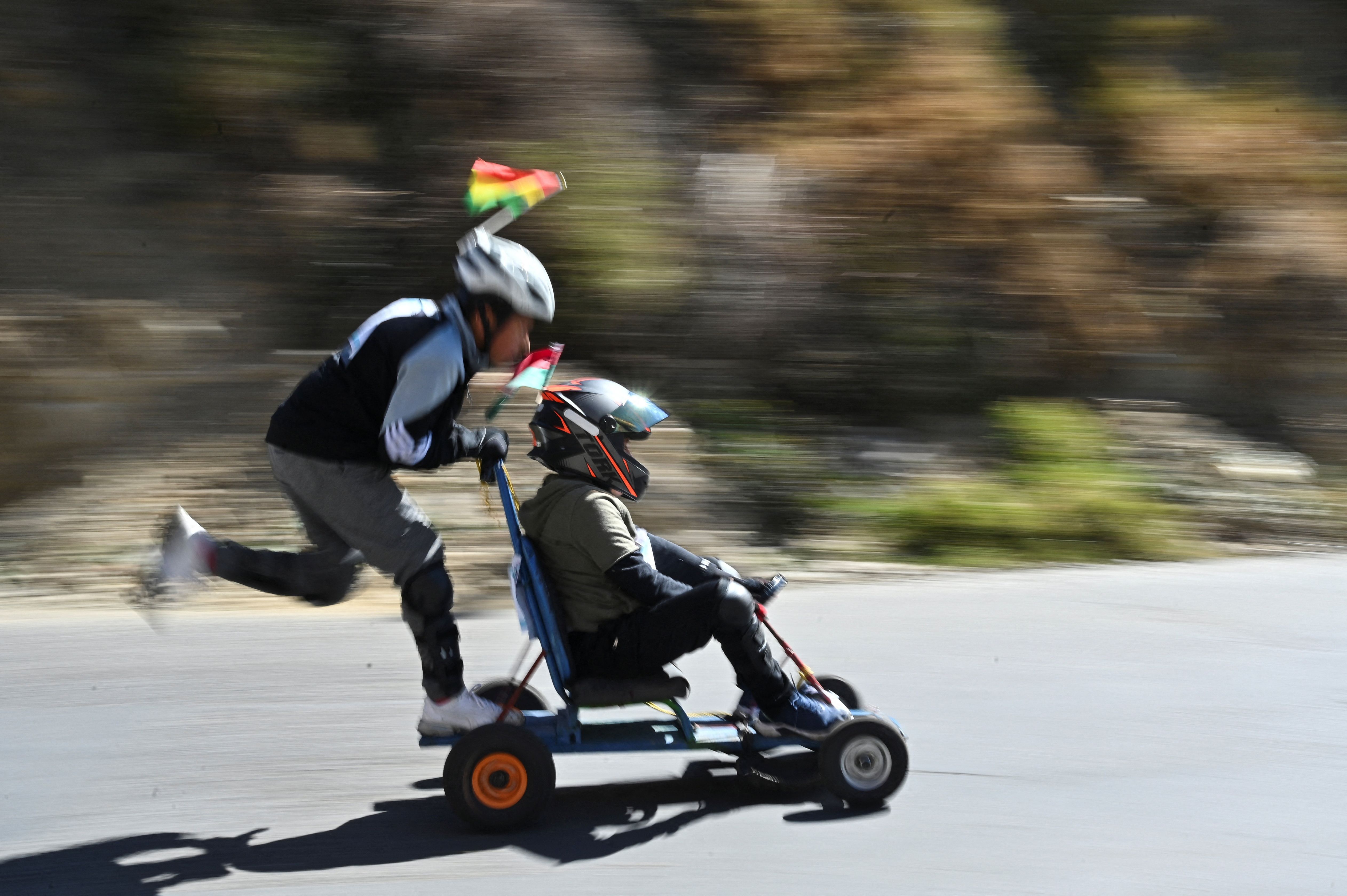 Children drive a homemade car as dozens of participants compete with hand-built motorless vehicles during the XXIV Motorless Car Race, in La Paz, Bolivia, on July 27, 2025. (Photo by Claudia Morales/Reuters)