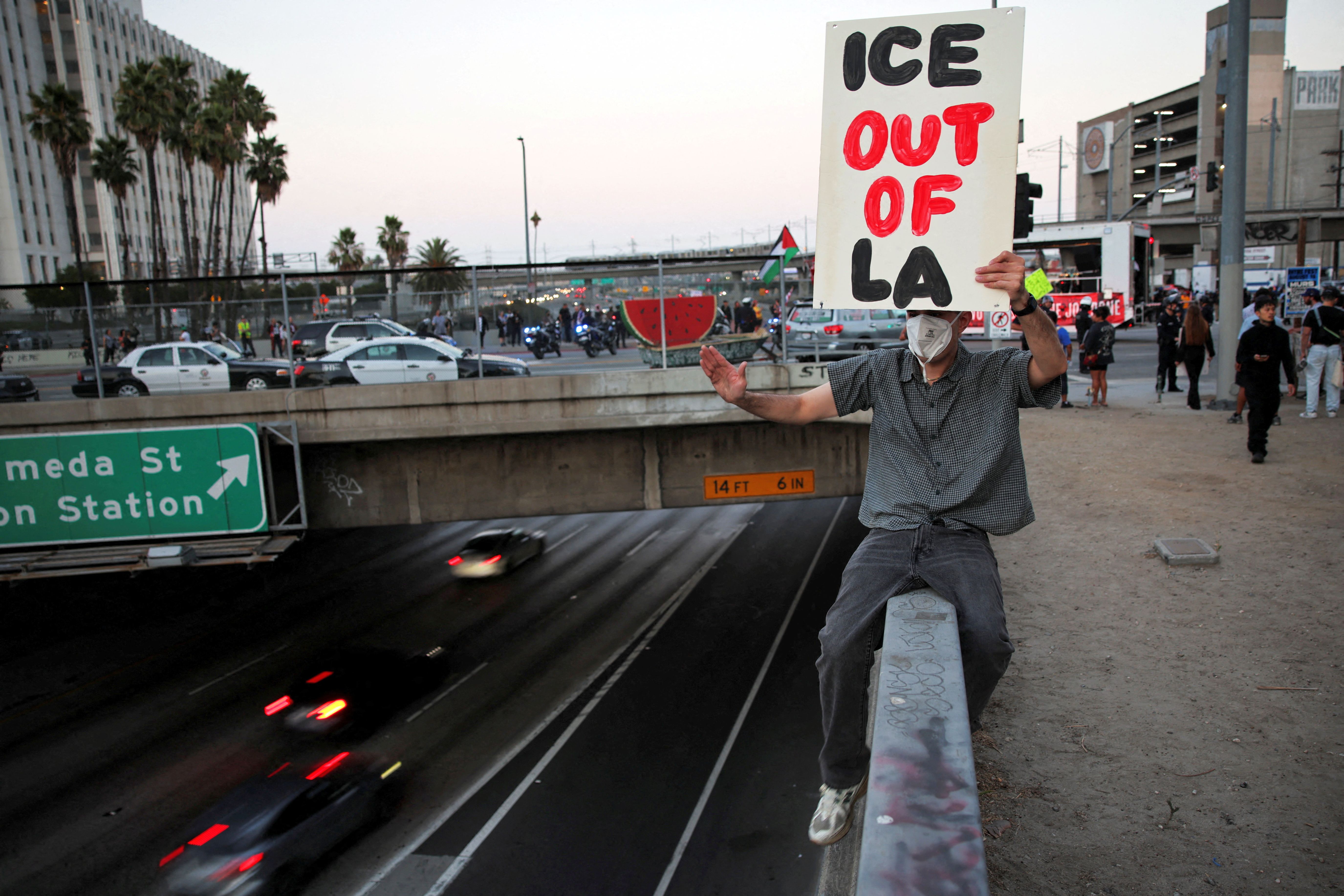 A protester encourages cars on the 101 Freeway to honk their horns during a demonstration in downtown Los Angeles organized by immigrant rights, labor, and grassroots groups to protest federal immigration enforcement actions in Los Angeles, California on August 13, 2025. (Photo by Daniel Cole/Reuters)