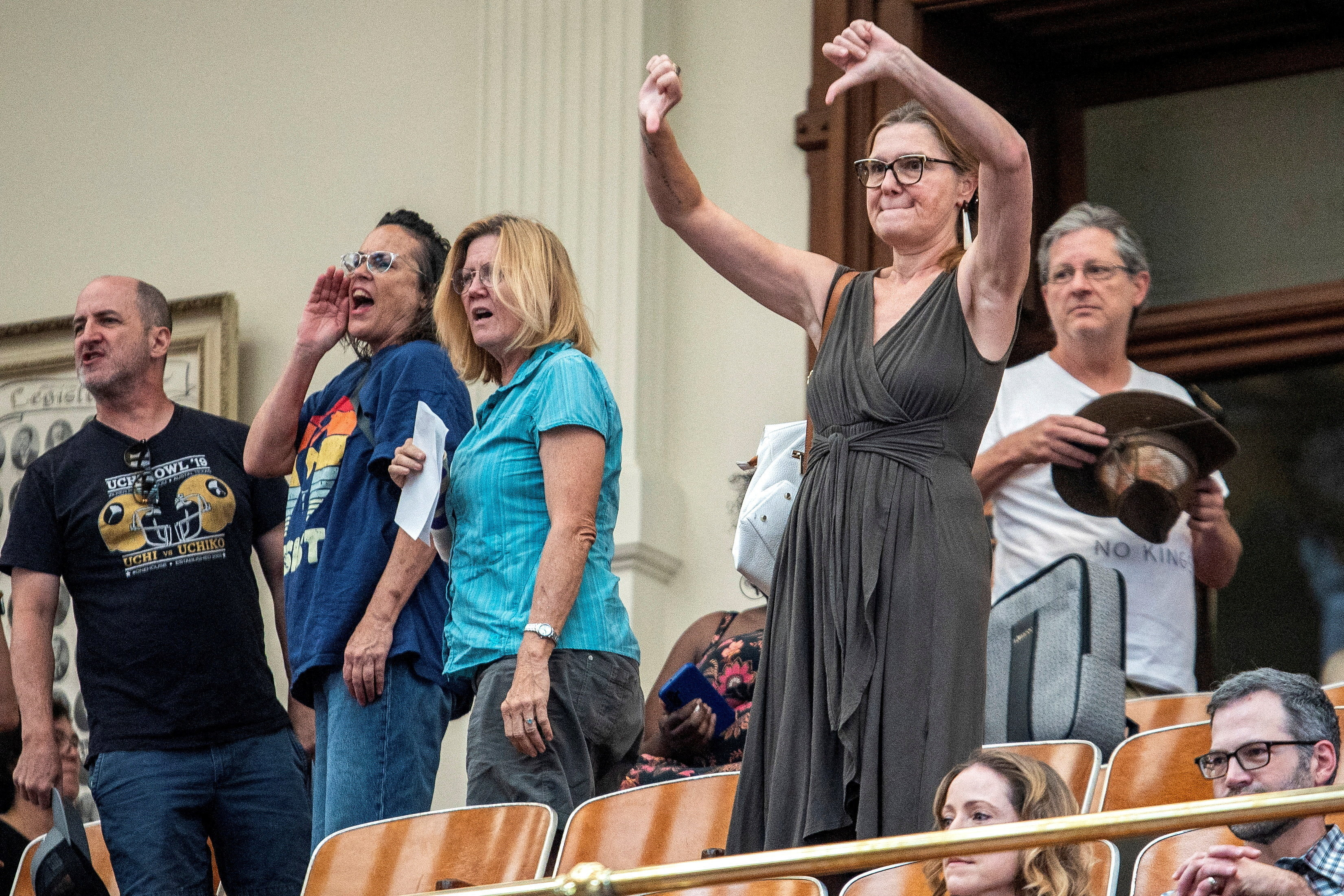 Protesters shout "cheaters" and gesture as the House of Representatives adjourns after Democratic lawmakers left the state to deny Republicans the opportunity to redraw the state's 38 congressional districts, in Austin, Texas on August 11, 2025. (Photo by Sergio Flores/Reuters)