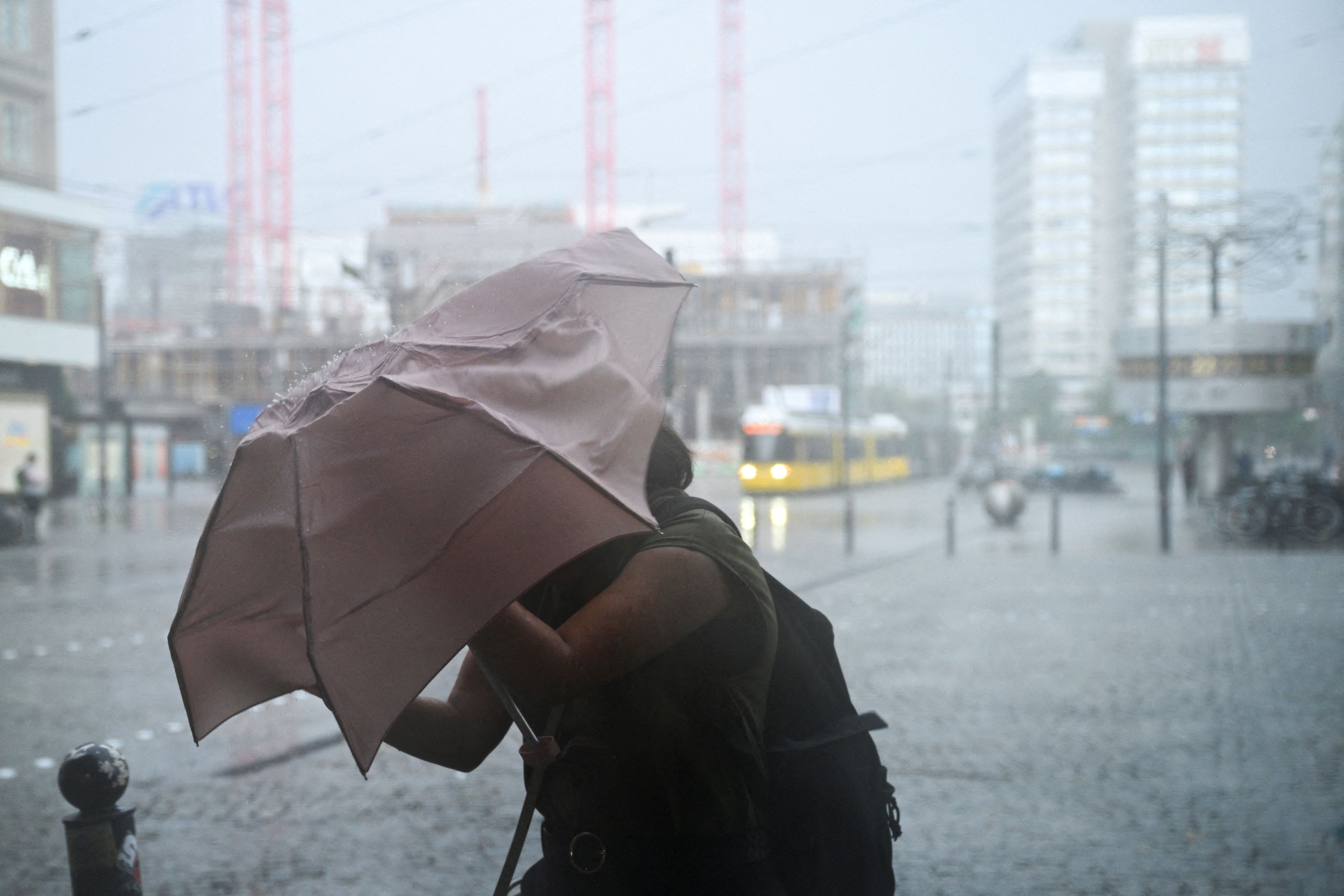 A woman shields herself with an umbrella on a street on Alexanderplatz square during stormy weather in Berlin, Germany on June 26, 2025. (Photo by Annegret Hilse/Reuters)