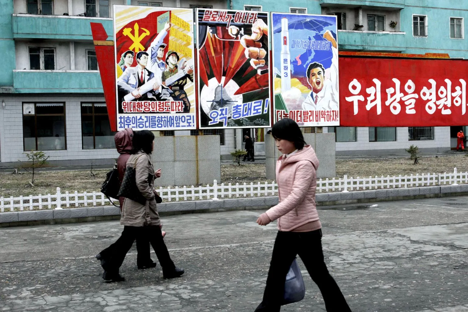 North Koreans walk past posters reading “Forward to the ultimate victory under the leadership of the great party!” left, “Not with words but with arms”, center, and “Higher, faster”, right, on Tuesday, March 19, 2013, on a street in Phyongchon District in Pyongyang, North Korea. The banner partially shown at right reads in its entirety “Let’s strengthen and enhance our party as the party of Kim Il Sung and Kim Jong Il!” (Photo by Jon Chol Jin/AP Photo)