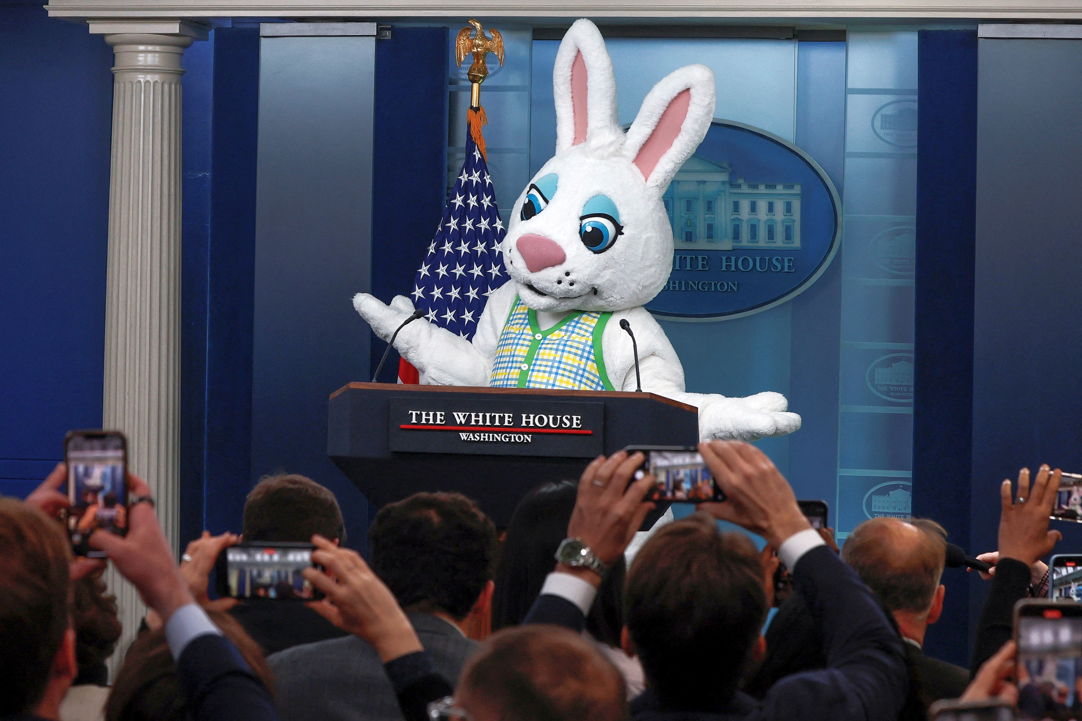 The Easter bunny makes a guest appearance in the White House briefing room, on April, 1, 2024. (Photo by Evelyn Hockstein/Reuters)