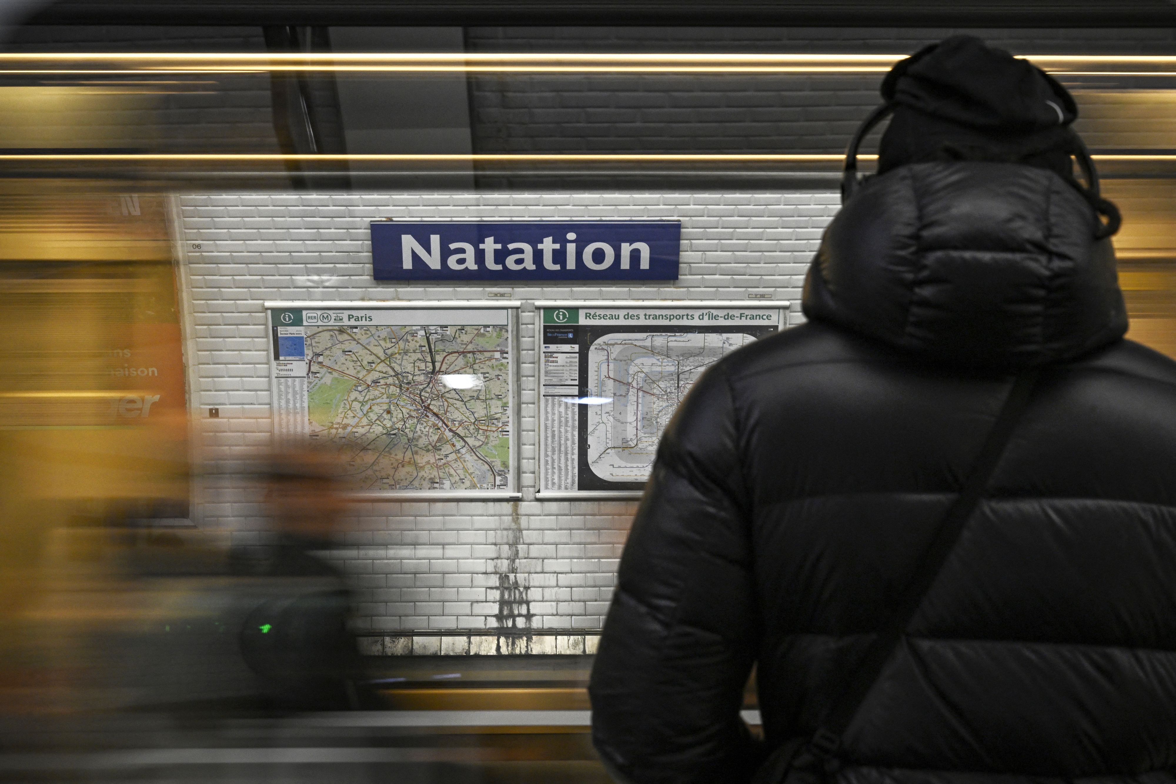 A person stands at a platform of the Paris' metro station Nation renamed on All Fools' Day as “Natation” as a reference to the upcoming Paris 2024 Olympics on April 1, 2024. (Photo by Julien de Rosa/AFP Photo)