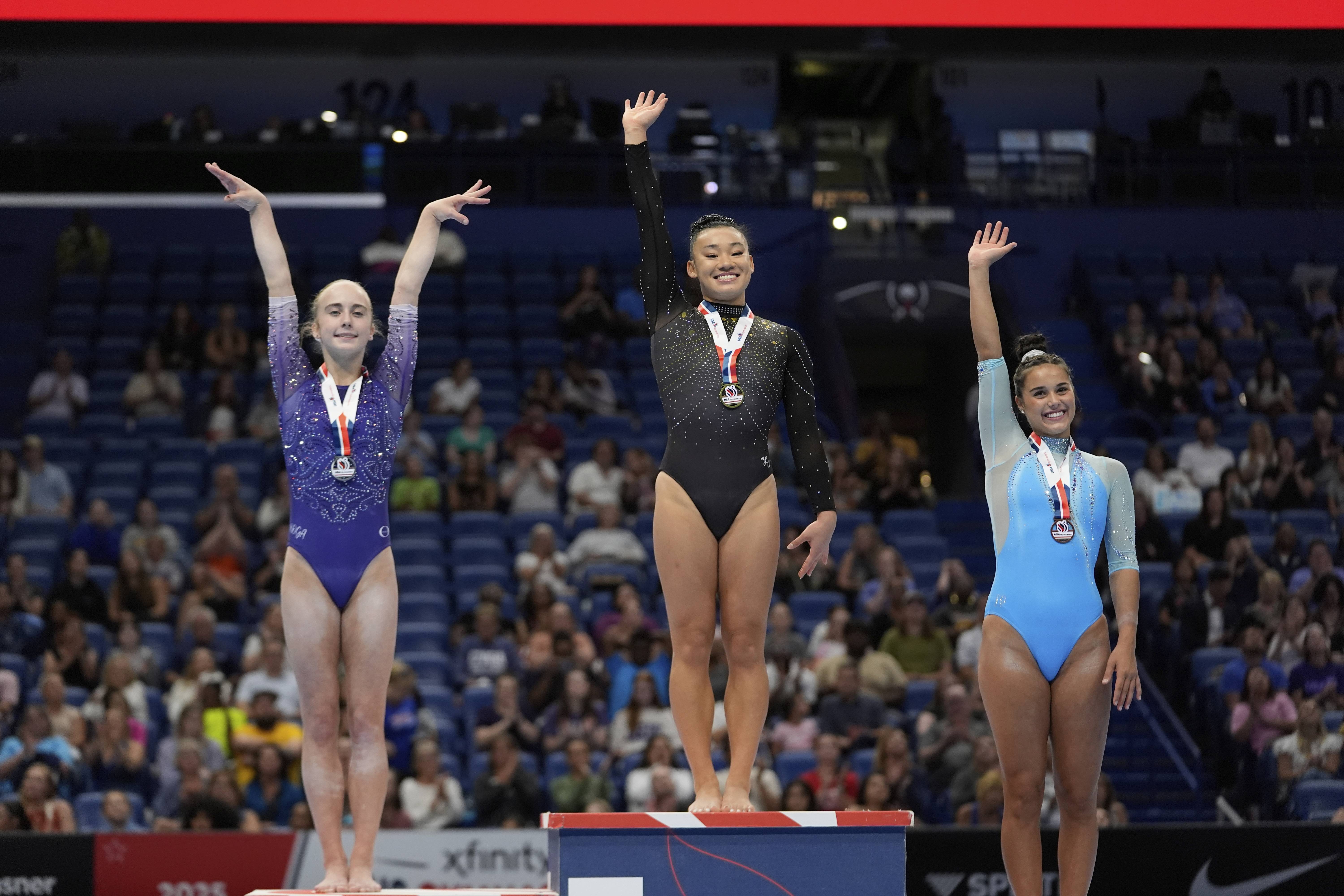 Vault gold medalist Leanne Wong of the University of Florida, center, silver medalist Claire Pease of WOGA, left, and bronze medalist Izzy Stassi of Gym X-Treme pose during a medal ceremony after the senior women's finals of the U.S. Gymnastics Championships in New Orleans, Sunday, August 10, 2025. (Photo by Gerald Herbert/AP Photo)