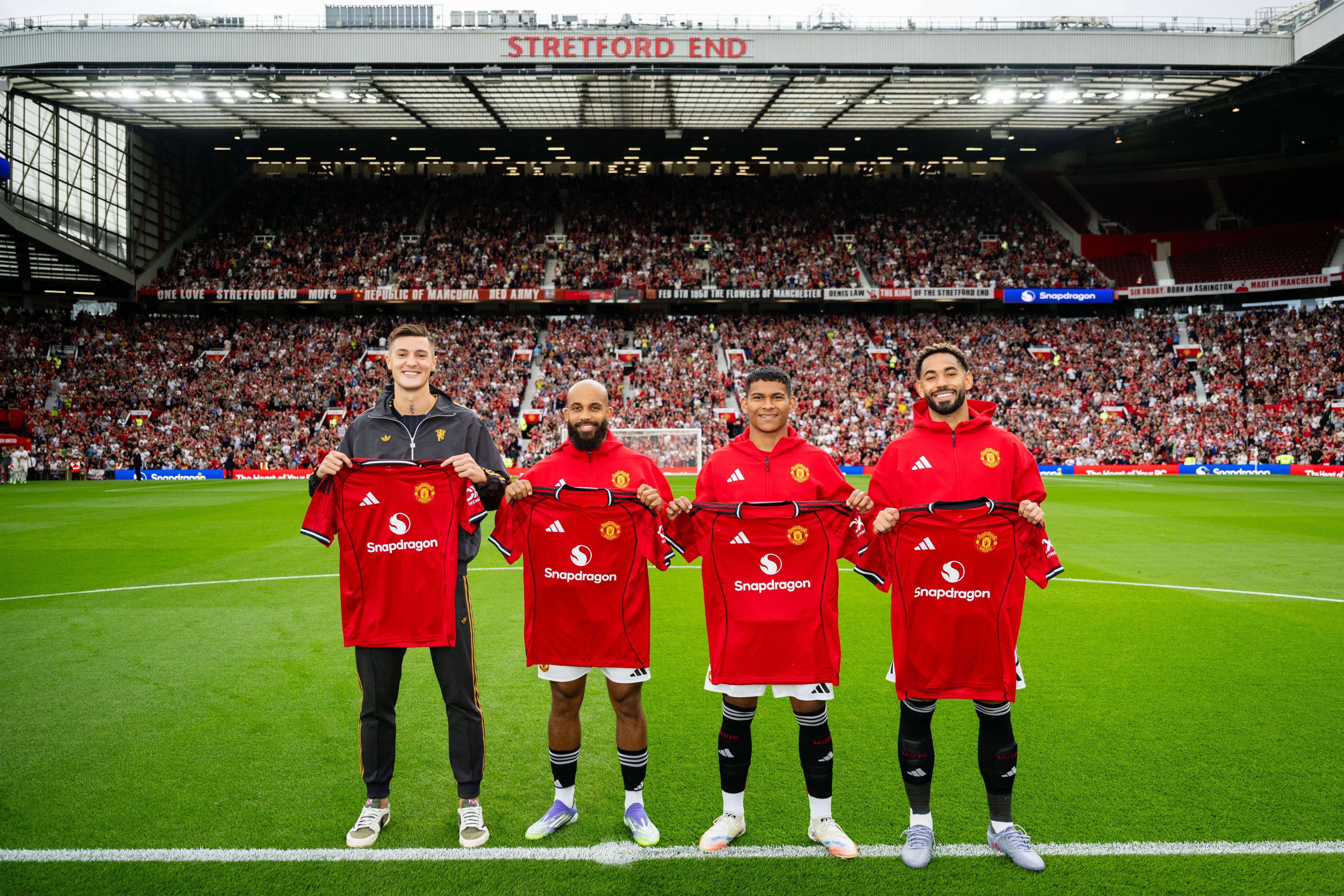 (L-R) New Manchester United signings Benjamin Sesko, Bryan Mbeumo Diego Leon & Matheus Cunha pose together with team shirts prior to the pre-season friendly match between Manchester United and ACF Fiorentina at Old Trafford on August 9, 2025 in Manchester, England. (Photo by Ash Donelon/Manchester United via Getty Images)
