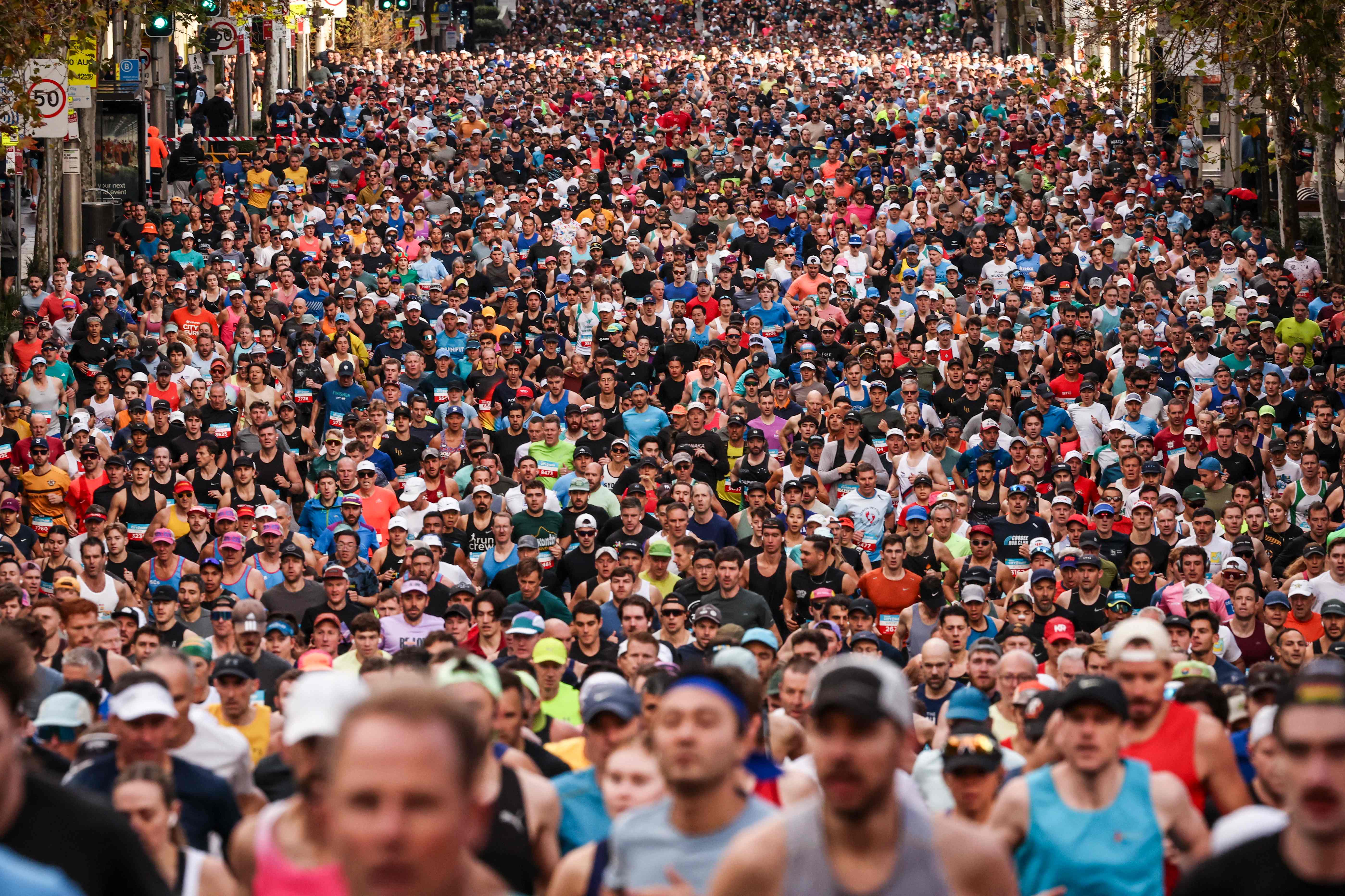 Participants run at the start of the annual City to Surf fun run in central Sydney on August 10, 2025. (Photo by David Gray/AFP Photo)