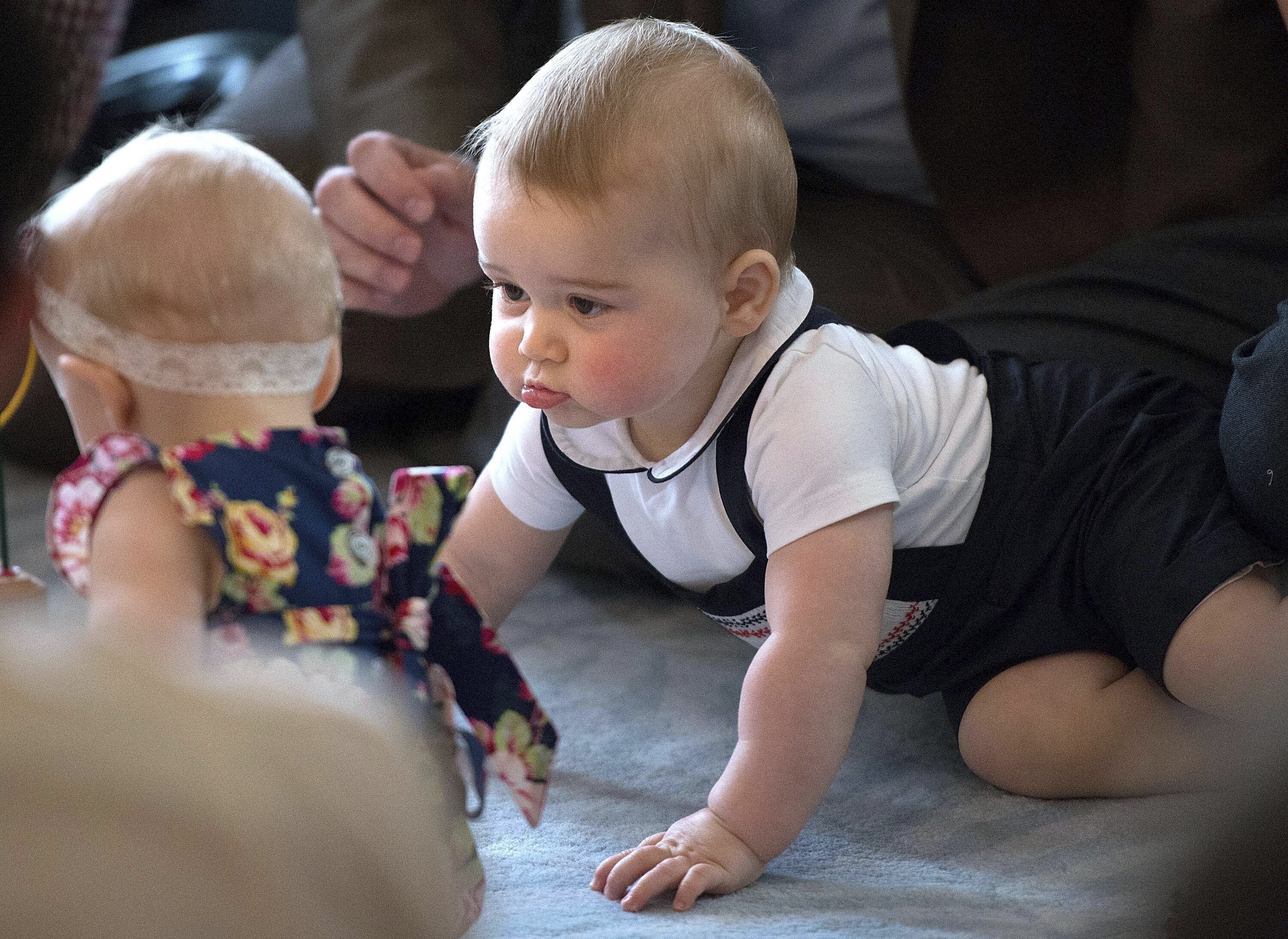 Britain's Prince George, right, plays during a visit to Plunket nurse and parents group at Government House in Wellington, New Zealand, April 9, 2014. (Photo by Marty Melville/Pool Photo via AP Photo)