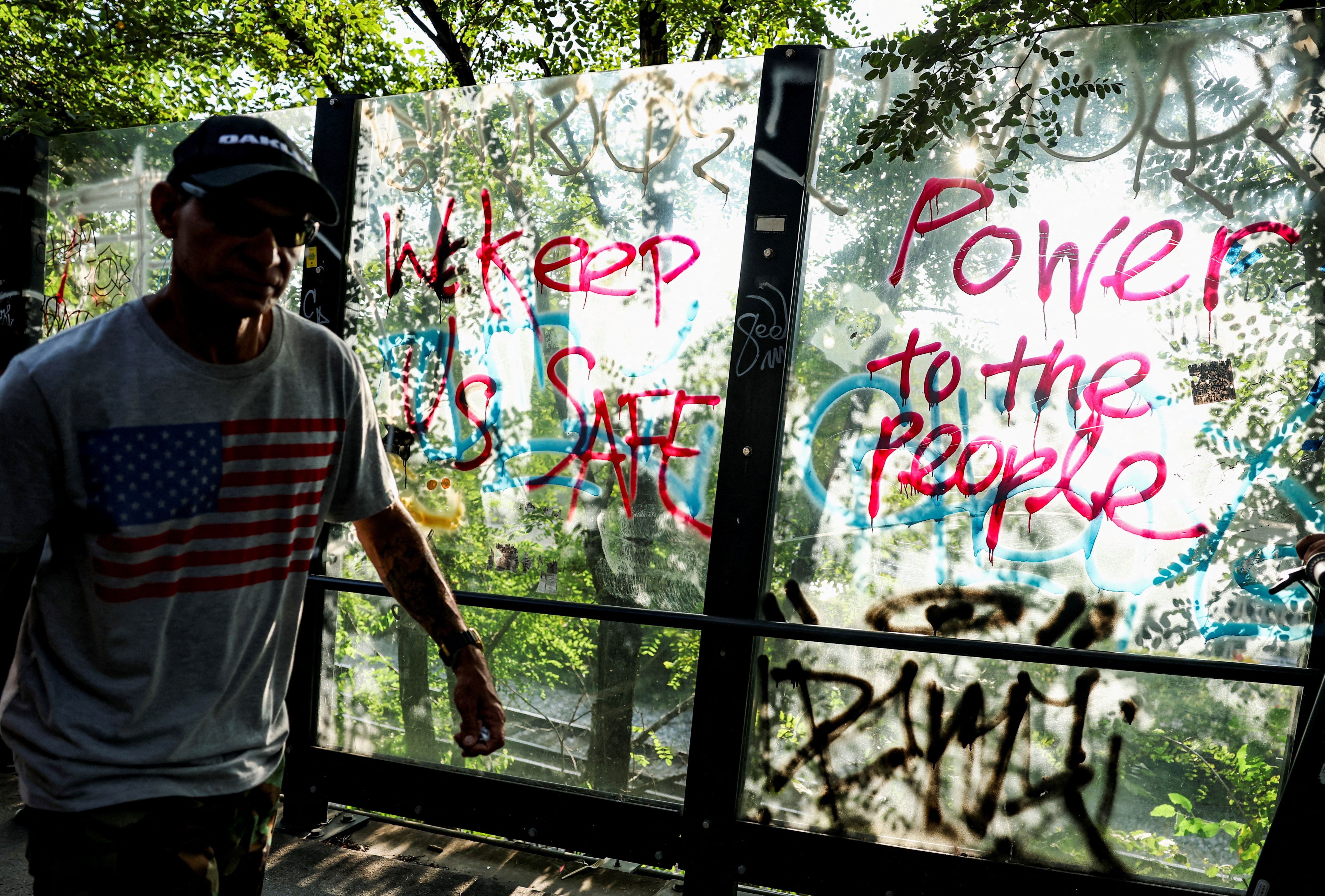 A man walks by graffiti on a pedestrian bridge reading “We keep us safe” and “Power to the people” after President Trump announced a federal takeover of the Metropolitan Police Department, in Washington, on August 12, 2025. (Photo by Jonathan Ernst/Reuters)