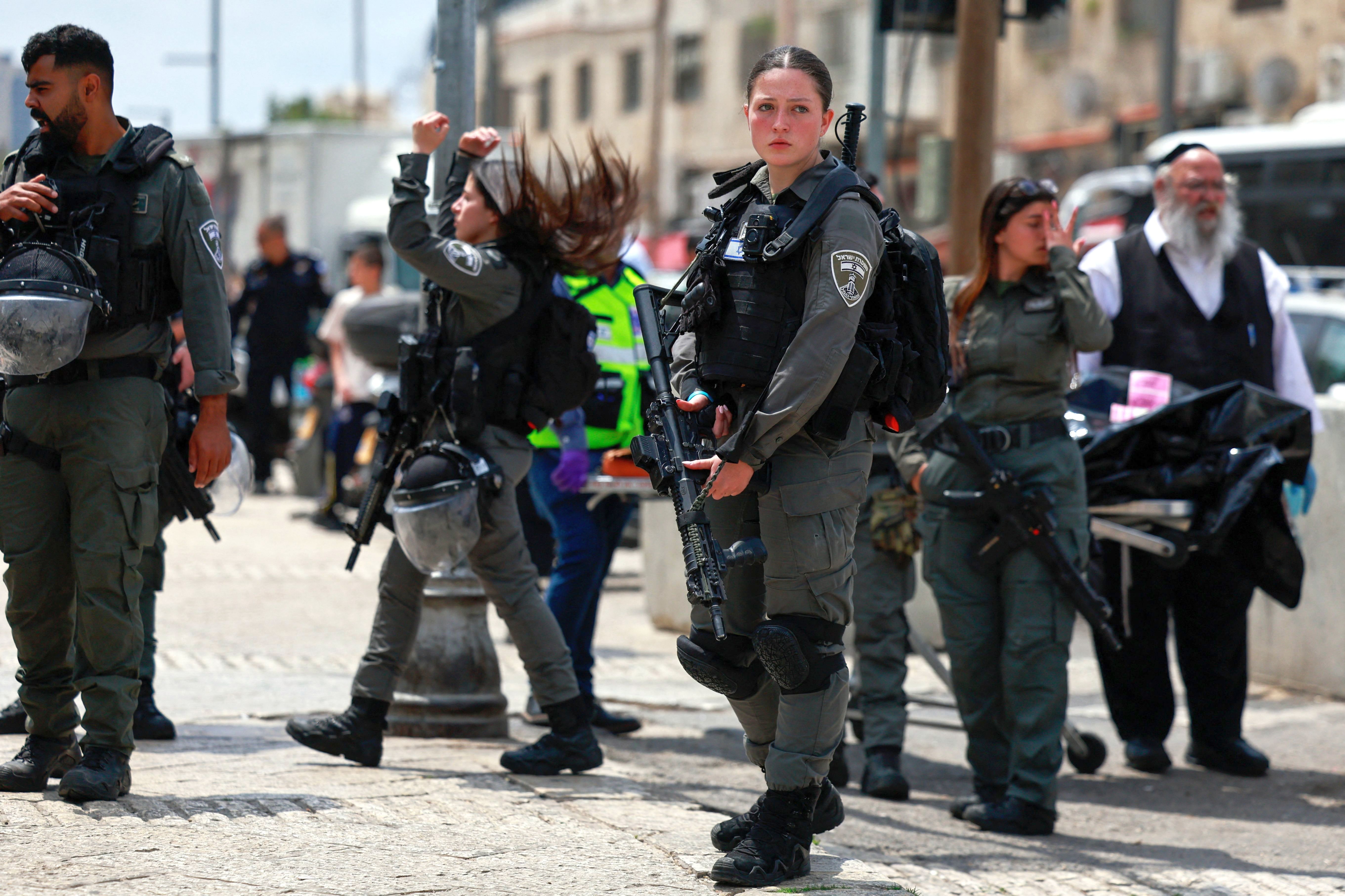 Israeli emergency personnel respond to a suspected stabbing attack, according to Israel's ambulance services, in Jerusalem on April 30, 2024. (Photo by Ammar Awad/Reuters)