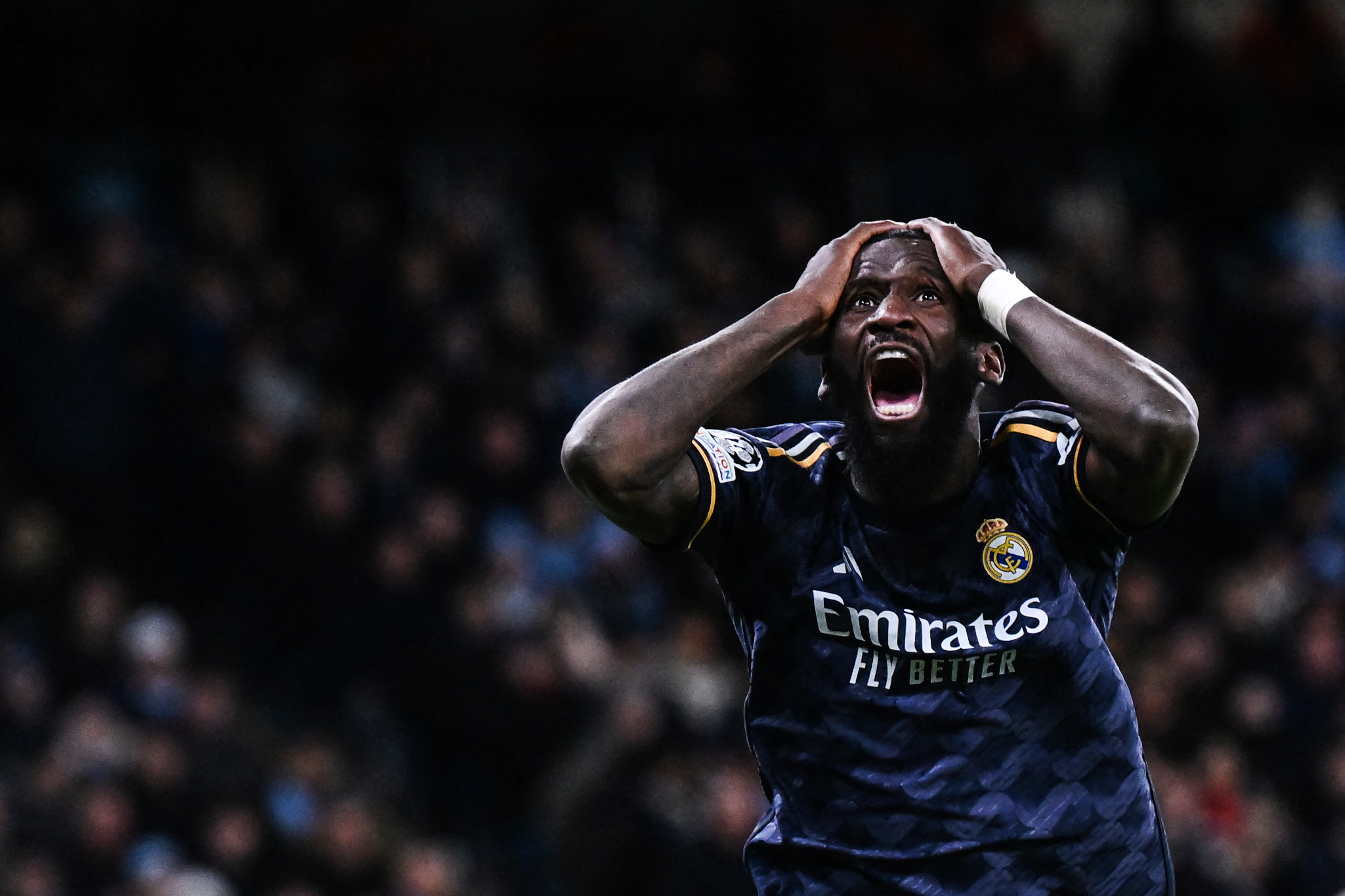 Real Madrid's German defender #22 Antonio Rudiger reacts following a missed chance during the UEFA Champions League quarter-final second-leg football match between Manchester City and Real Madrid, at the Etihad Stadium, in Manchester, north-west England, on April 17, 2024. (Photo by Paul Ellis/AFP Photo)