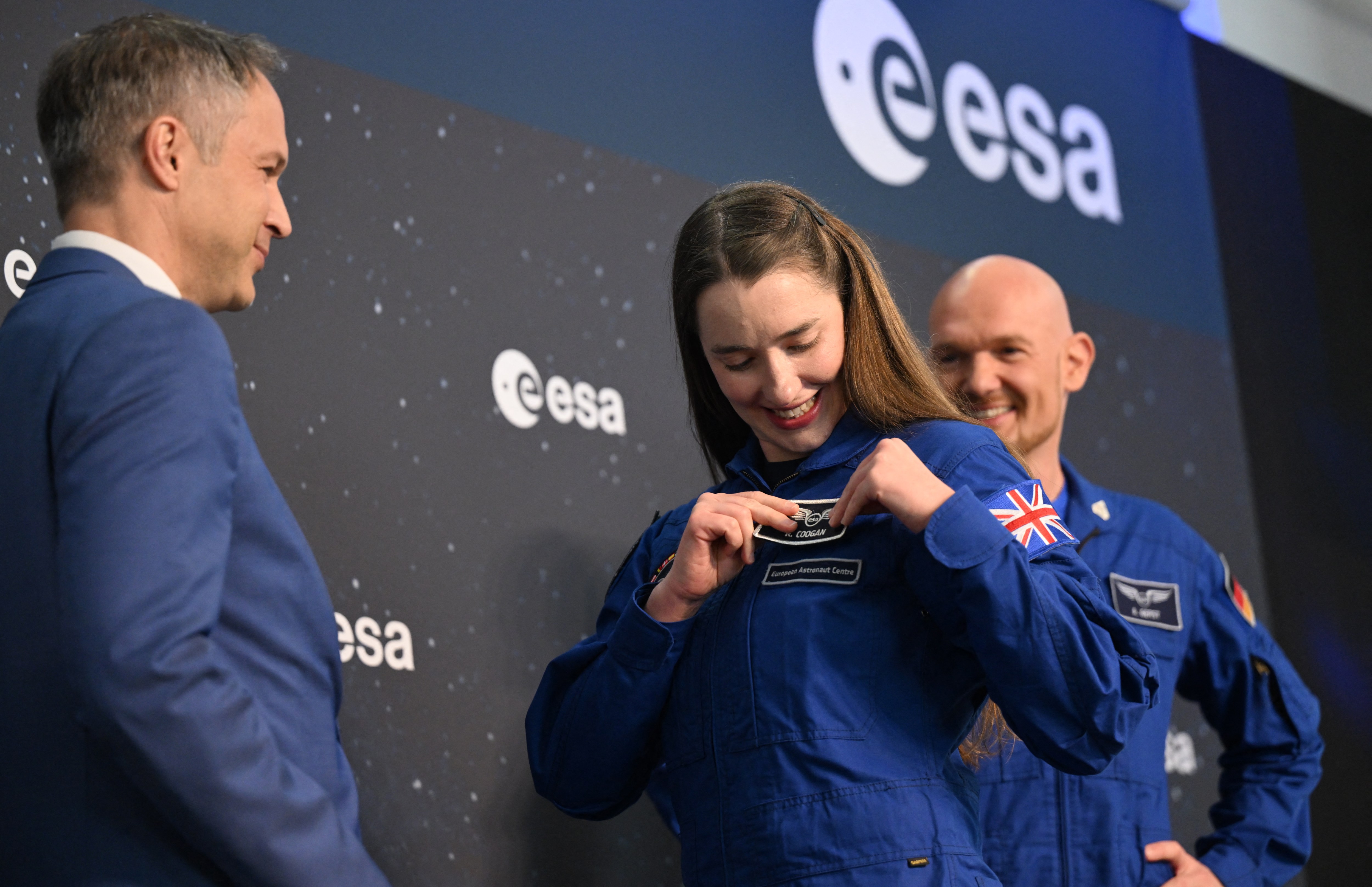 Alexander Gerst (R), astronaut of the European Space Agency (ESA), looks on as ESA astronaut graduate Rosemary Coogan attaches her new badge during a graduation ceremony on April 22, 2024 at the European Astronaut Centre (EAC) in Cologne, western Germany. Five ESA astronaut candidates and one Australian astronaut candidate took up duty at the European Astronaut Centre one year ago to be trained to the highest level of standards as specified by the International Space Station partners. After successful completion of basic training, they now are graduate. (Photo by Ina Fassbender/AFP Photo)
