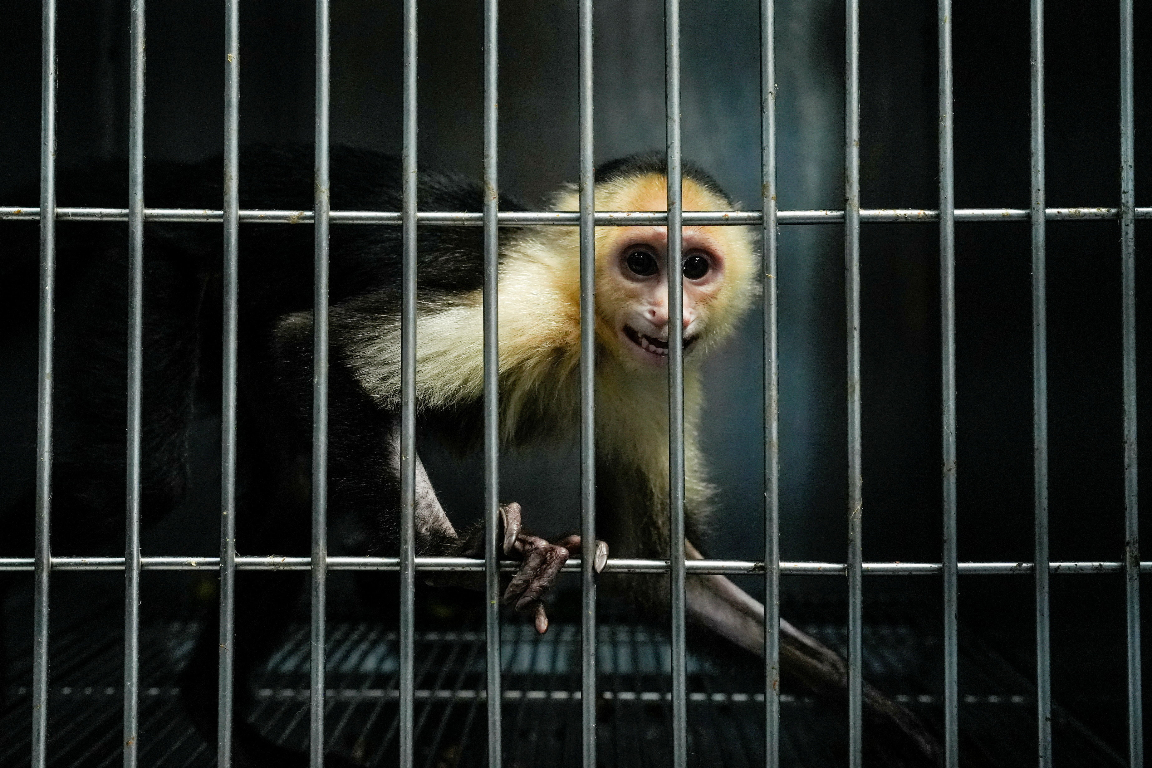 A white-faced capuchin monkey rescued from animal trafficking stands in a cage, as medical teams prepare him for his future release into the wild, at a wildlife veterinary hospital, in Panama City, Panama, on August 13, 2025. (Photo by Enea Lebrun/Reuters)