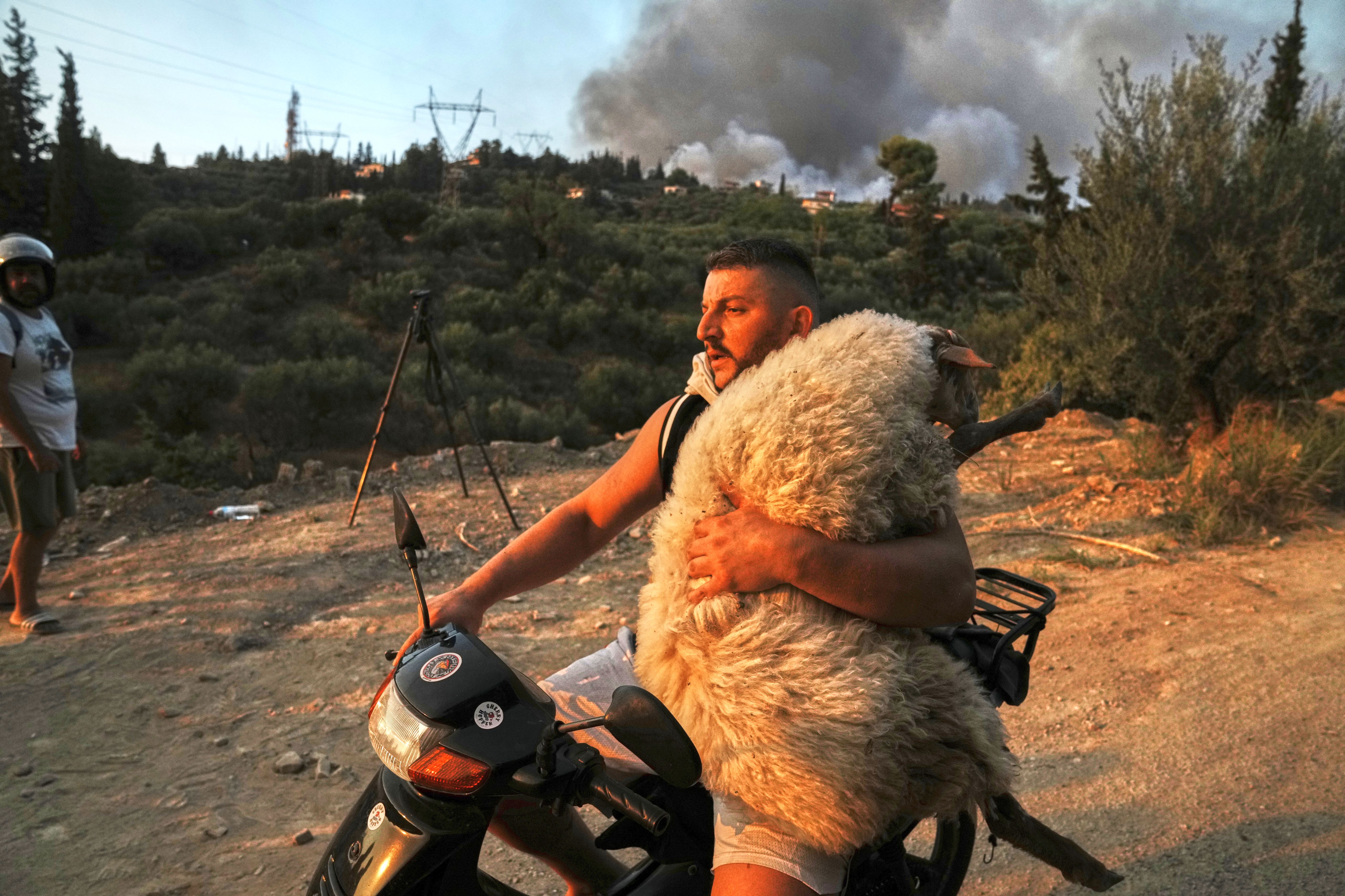 A man carries a sheep on the motorcycle during a wildfire in Patras city, western Greece, Wednesday, August 13, 2025. (Photo by Thanassis Stavrakis/AP Photo)