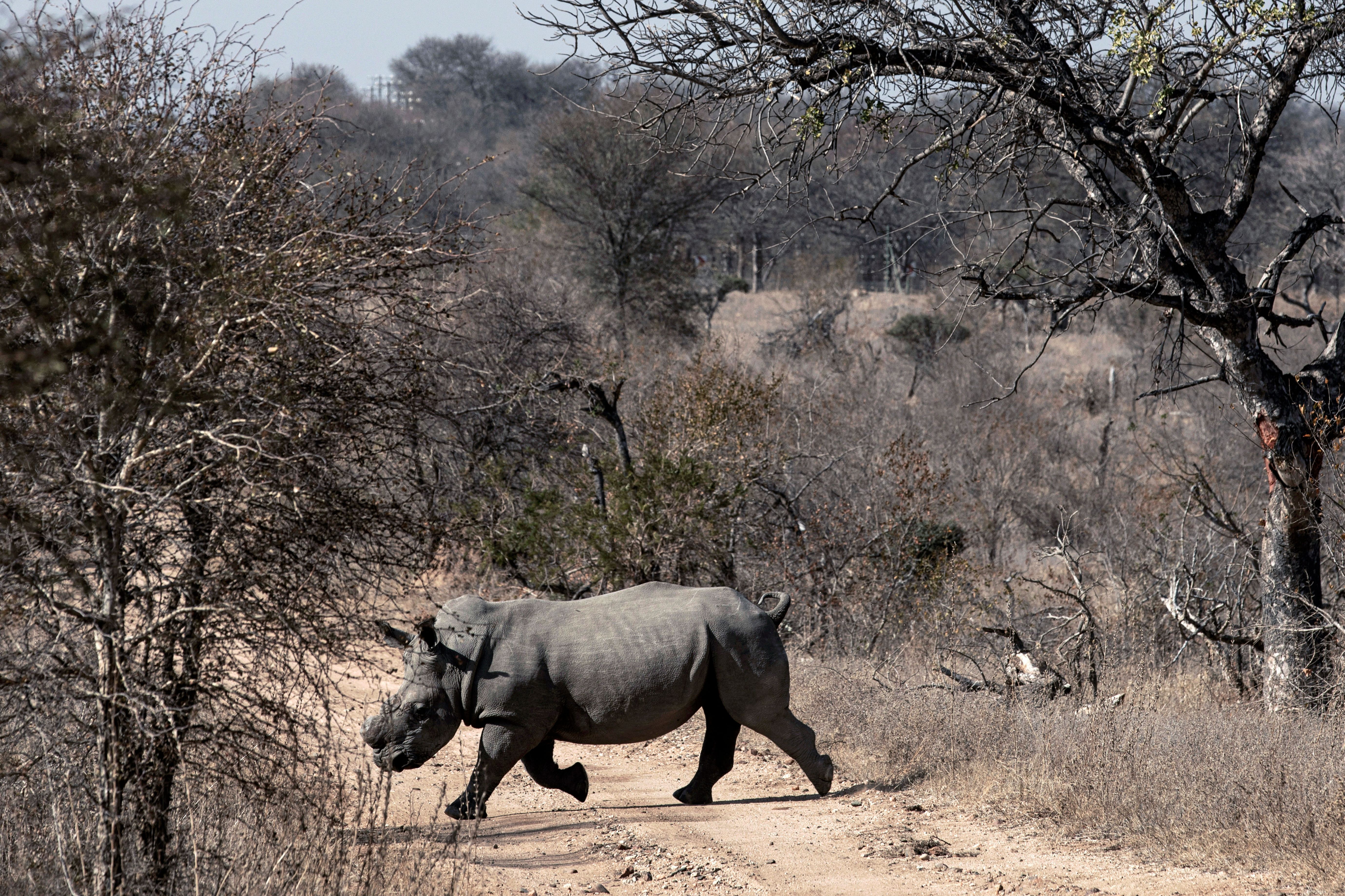 A white Rhino crosses a dirt road as members of the all-female anti-poaching unit (APU) Black Mambas patrol an area of the vast park on August 1, 2025 in Olifants West Nature Reserve, in Limpopo Province, South Africa. Dehorning of Rhinos has cut about 80% of rhino poaching, and the horns are usually cut every 18-24 months. The Black Mambas Anti-Poaching Unit was founded in 2013 by Transfrontier Africa and now consists of 36 members who patrol the park along fences, by foot and vehicle. Their daily work consists of foot patrols, snare sweeps, night vehicle patrols and education in the surrounding communities, which has resulted in greater awareness and significant cuts in poaching. The unarmed women often grew up in nearby communities and are now helping to educate their communities about wildlife. (Photo by Per-Anders Pettersson/Getty Images)