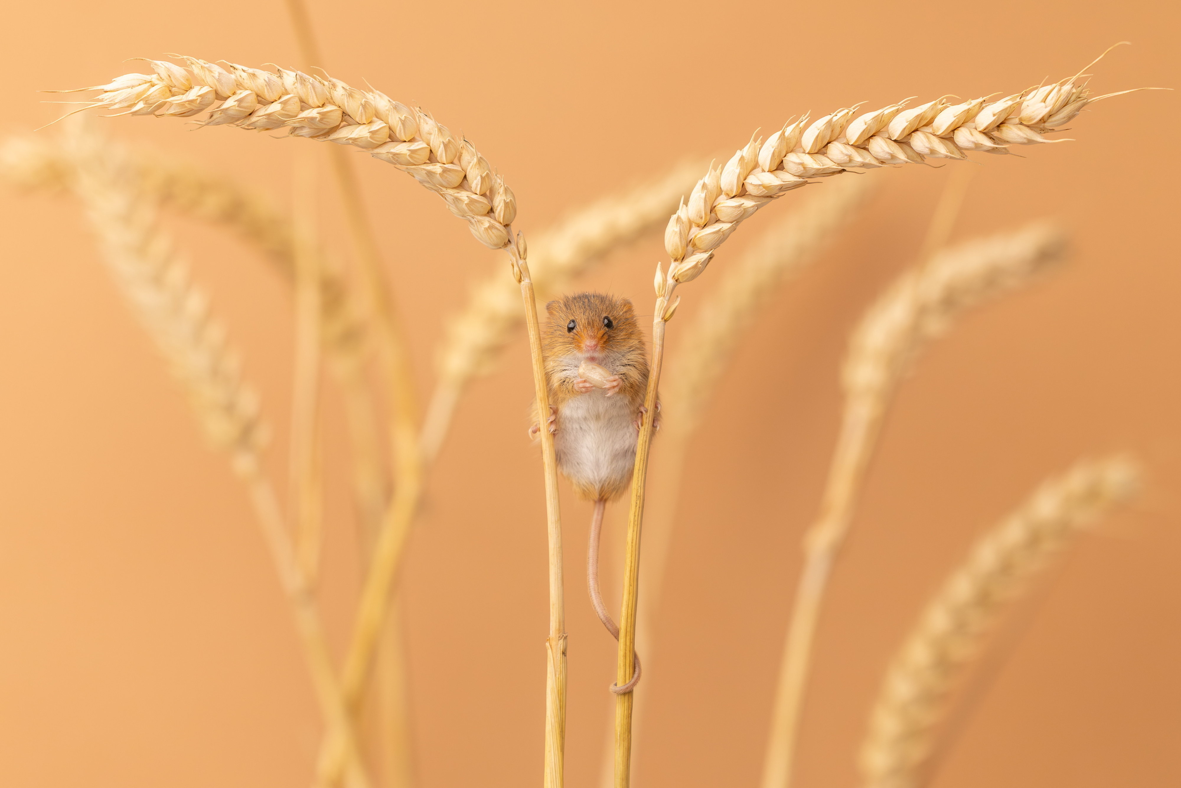 Stunning image capture the moment a tiny harvest mouse uses wheat stems as stilts as he munches on a kernel in UK in August 2025. The minute-mouse, who weighs as much as a 2p coin and is only two-inches-long, uses his prehensile tail to keep himself perfectly level. (Photo by Tony Nellis/South West News Service)
